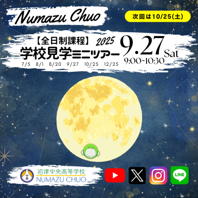 9月27日(土)は中学生対象の募集イベント「学校見学ミニツアー」が開催されます。今回は今年度全6回開催予定の4回目となります。授業はありませんので、在校生はいませんが部活動の生徒と会えるかも…休日の学校を探検してみてください!時間は9:00~10:30で、8:45より受付を開始いたします。予約サイト(miraicompass)のマイページより「受付票」を印刷し、当日受付へ提出してください。また、上履き・下足袋をご持参下さい。