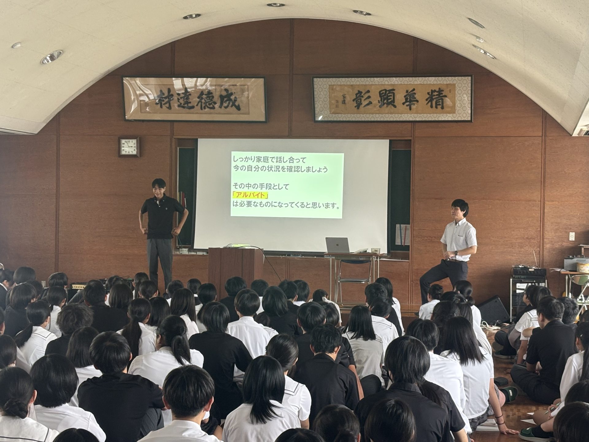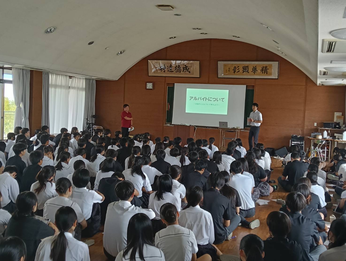 9月19日(金)の6限に1年生を対象に就職指導課より、アルバイトについて話がありました。高校生活の中でアルバイトを経験することは、社会との接点を持ち、責任感や時間管理能力を養う貴重な機会となります。一方で、学業との両立や、進路選択への影響についても慎重に考える必要があります。アルバイトを通じて得られる力や注意すべき点、そして将来の就職や進学に向けて今からできる準備について話がありました。特に、進路に応じた情報収集の重要性や、働くことの意味について、生徒たちは真剣に耳を傾けていました。今後の進路選択に向けて、アルバイトを含めた「社会との関わり方」をどう考えるかは、生徒一人ひとりにとって大切なテーマです。先生や保護者と相談しながら、自分にとって最適な選択をしていきましょう。