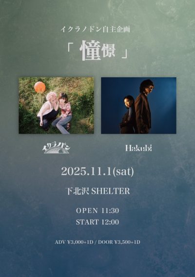 軽音楽部の卒業生バンド「イクラノドン」が、11月1日(金)に下北沢にて自主企画ライブを開催します!しかも、今回の対バンは…なんとメジャーシーンで活躍中のバンド Hakubi(ハクビ)!この2組の共演は見逃せません!