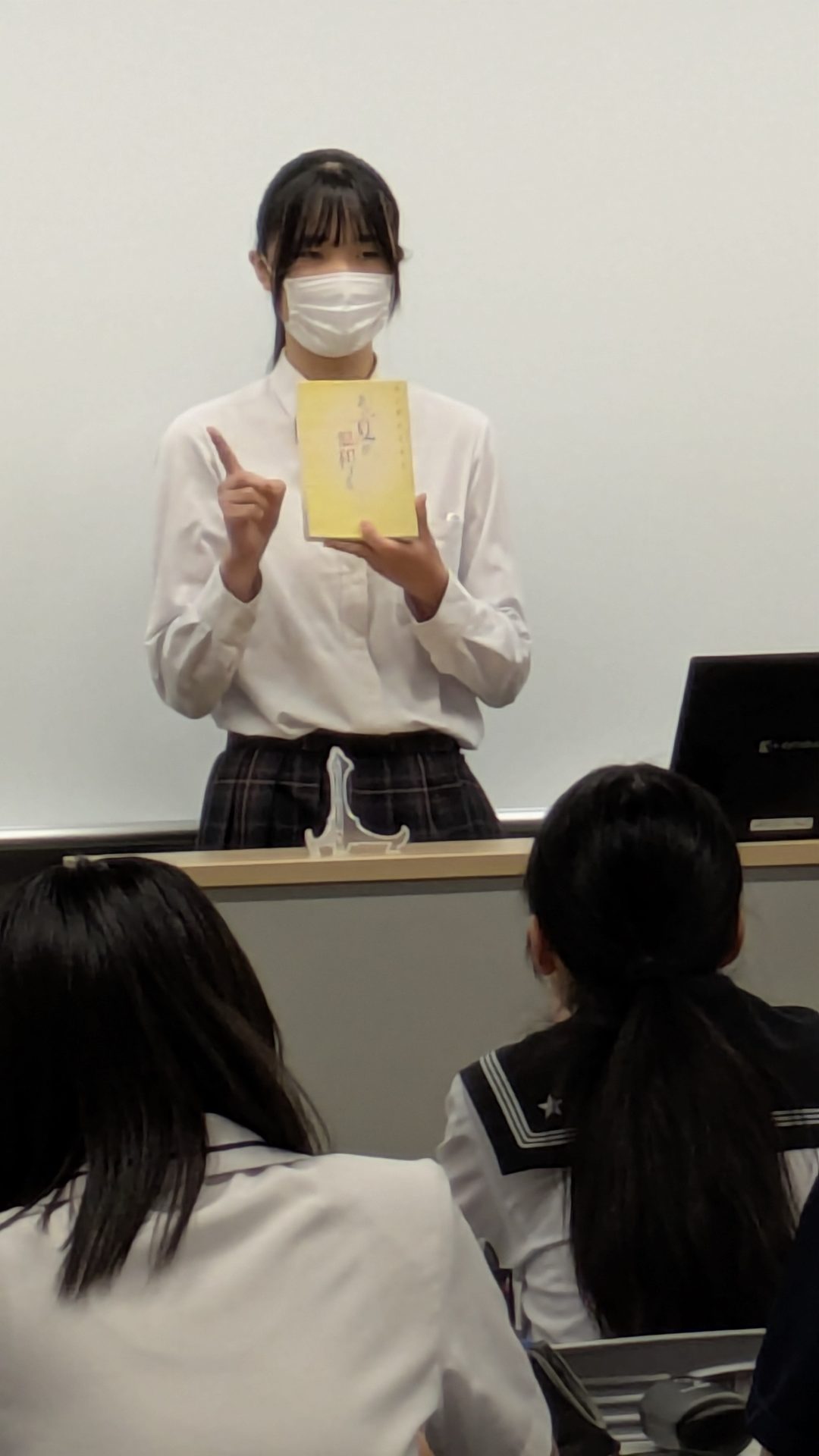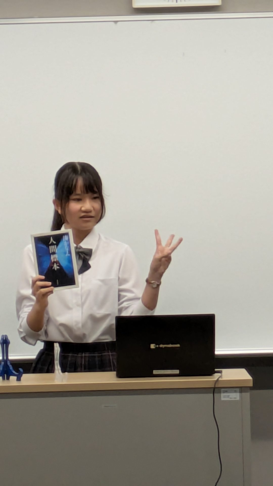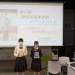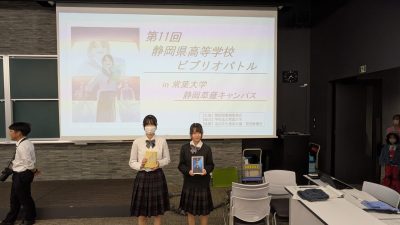 9月20日(土)、常葉大学静岡草薙キャンパスで開催された「第11回静岡県高等学校ビブリオバトル」に、本校から中西芽生さん(2年・北上中出身)と赤池瑠唯さん(1年・富士宮第二中出身)の2名が出場しました。図書委員としても活動している2人は、6月に行われたたちばな祭文化の部で「ミニビブリオバトル」に参加し、校内選考を通過しました。当日は、県内の高校生が集まり、それぞれが推薦する本の魅力を熱く語り合う知的書評合戦が繰り広げられ、高校生らが堂々としたプレゼンテーションで会場を魅了しました。本を通じて自分の考えを伝える力、聞き手の心を動かす表現力を磨く貴重な経験となりました。赤池さんは「最初こそ緊張していたけど、良い雰囲気の中で本の紹介ができて、とても楽しい時間を過ごせました」と、当日の様子を振り返りながら話してくれました。また、後期から図書委員長になった中西さんは「本の魅力を伝え、感じることができ、とても貴重な経験となりました。今期は委員長として生徒のみなさんに本に興味・関心を持ってもらえるよう精一杯頑張ります」と、今後の活動についても触れながら話してくれました。