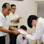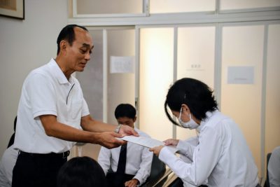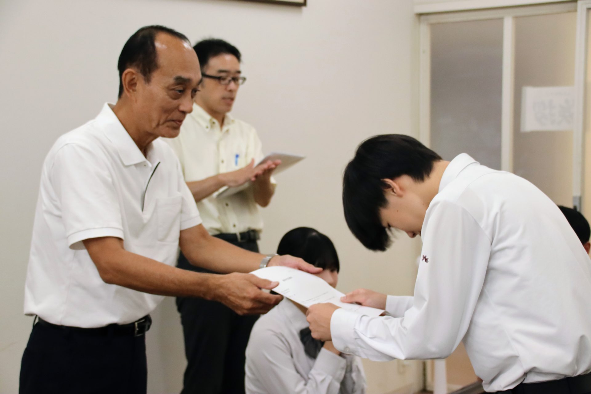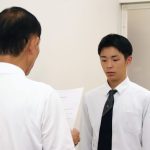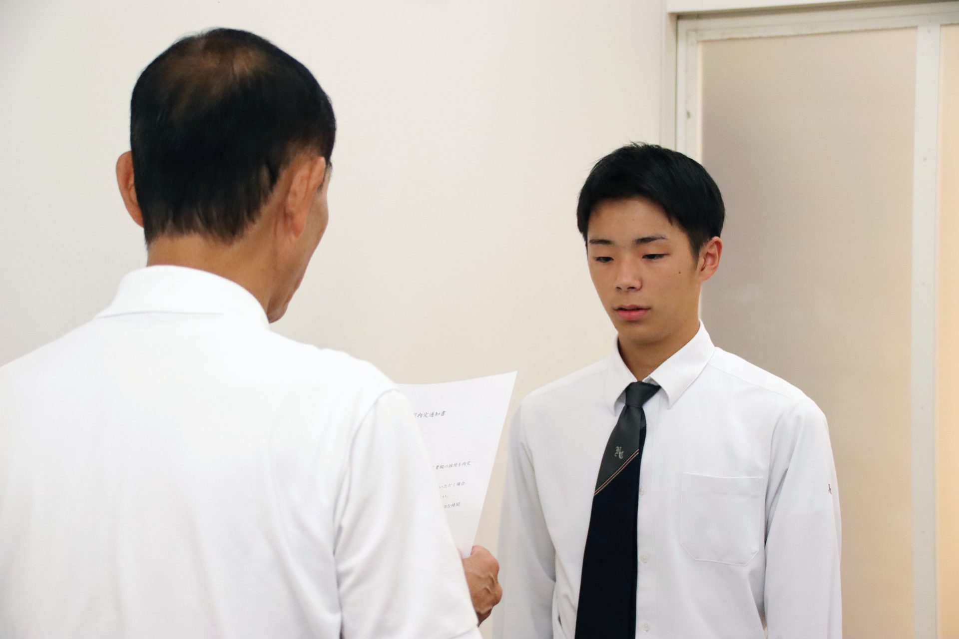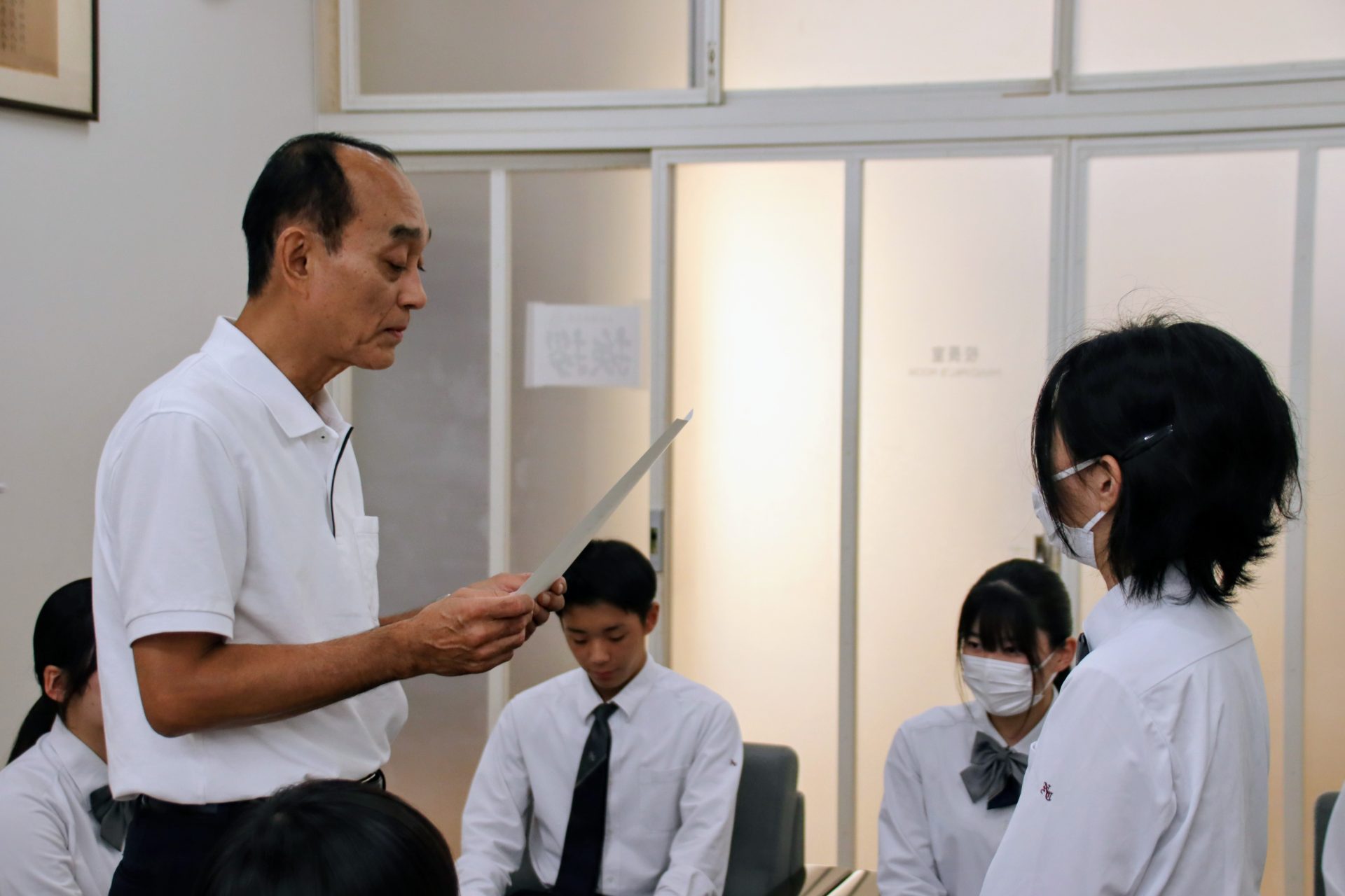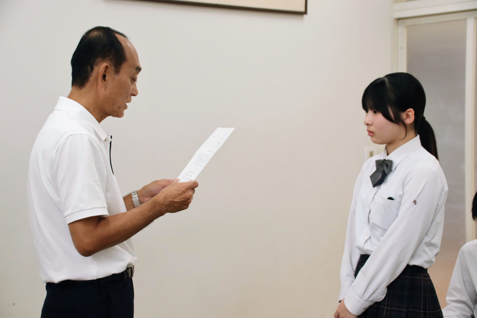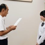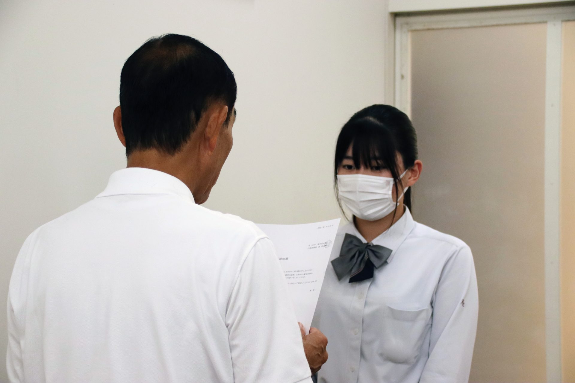9月から高校生の就職試験がスタートし、本校でも初陣を迎えた生徒たちが次々と内定しており、進路実現に向けて大きな一歩を踏み出しています。この日は、校長室にて7名の内定者に対して、校長先生から内定通知書が手渡されました。校長室では、一人ひとりに対して「どんな試験だったか」「どのような仕事の内容か」「住まいや通勤について」など、丁寧な対話が行われ、進路決定後の生活や職場での心構えについてもアドバイスがありました。また、「卒業までの高校生活をしっかりと過ごすように」と、温かいエールも贈られました。国立印刷局(国家公務員)に内定した工芸デザインコースの山本さくらさん(沼津第五中出身)は、「努力が実を結んで良かったです。まだ実感がわいていませんが、とりあえずほっとしています。これから大学入試や就職試験を控えている人もいるので、自分の経験を通して学んだことを活かして、少しでもサポートしてあげたいと思っています」と、喜びとともに仲間への思いやりの気持ちを語ってくれました。山本さんの言葉からは、これまでの努力が形となった瞬間の安堵と達成感、そして周囲への感謝と支援の意志が感じられました。今後も、進路決定に向けて挑戦を続ける生徒たちが互いに励まし合いながら、それぞれの目標に向かって歩んでいけるよう、学校全体で応援していきます。