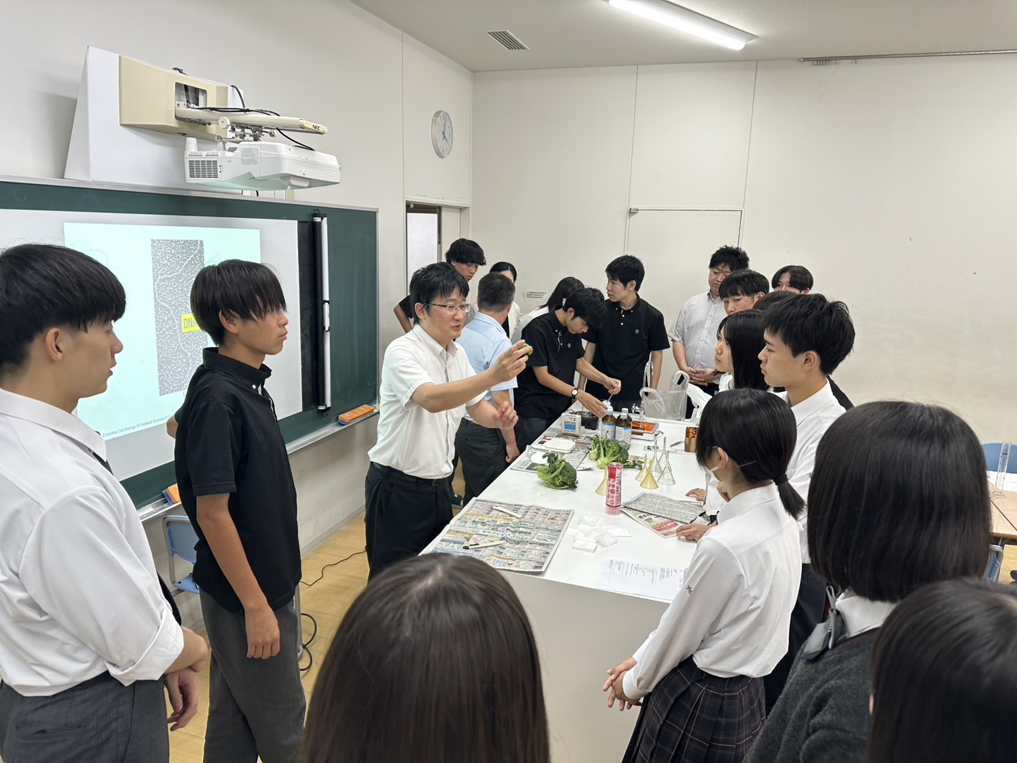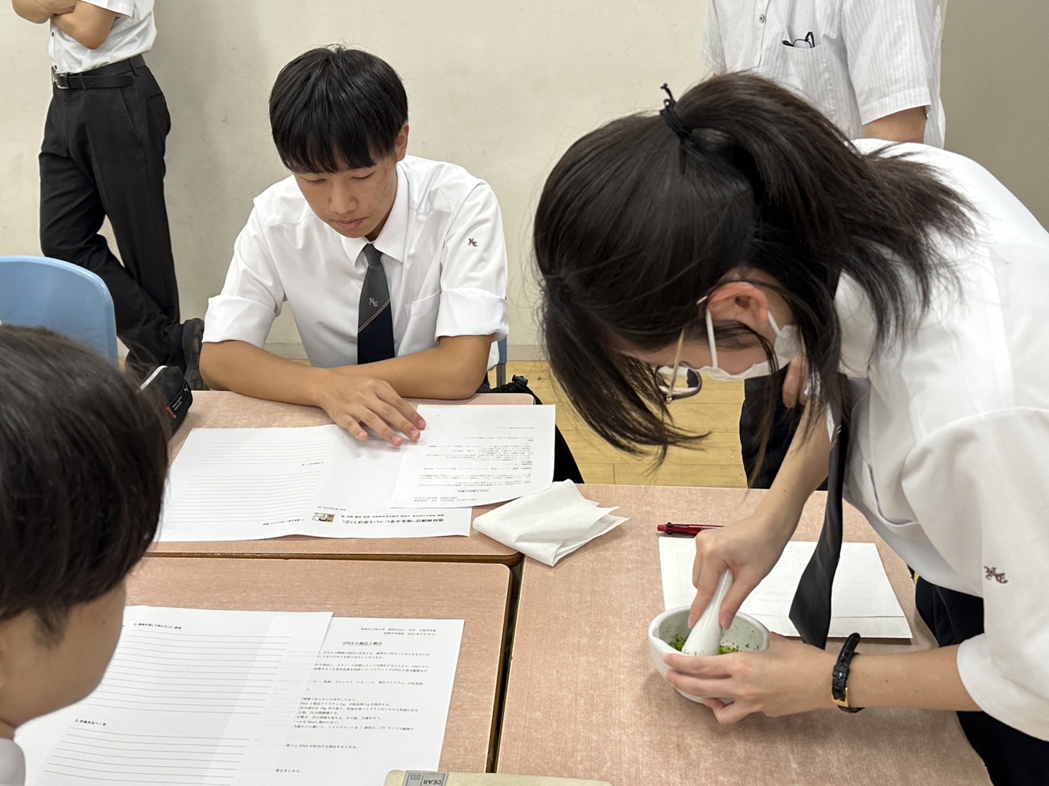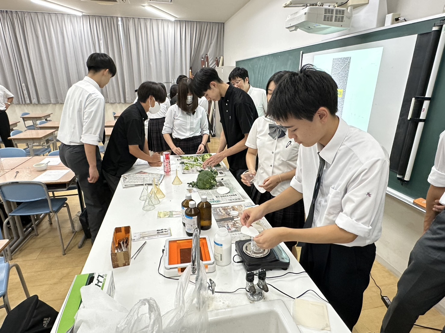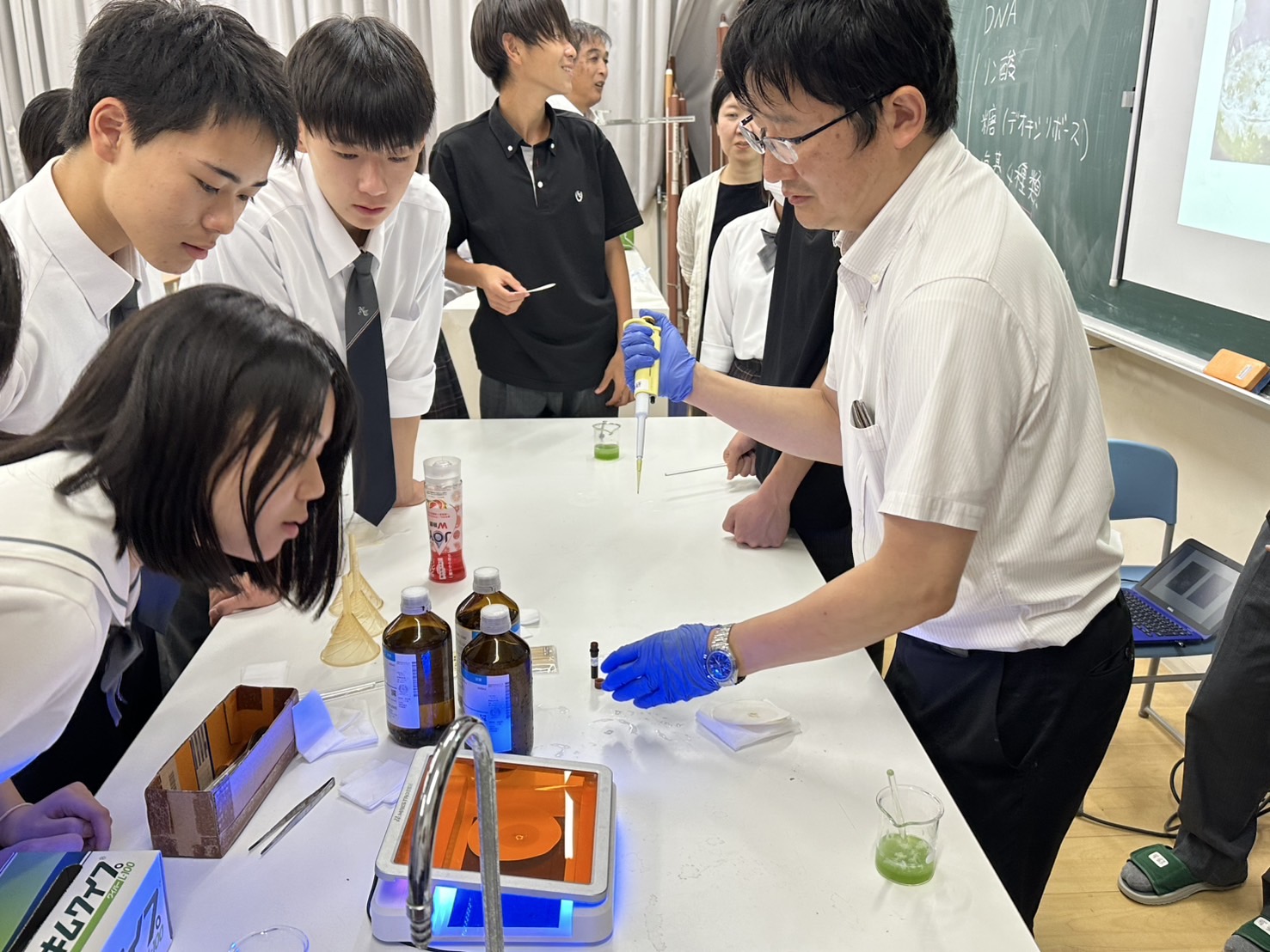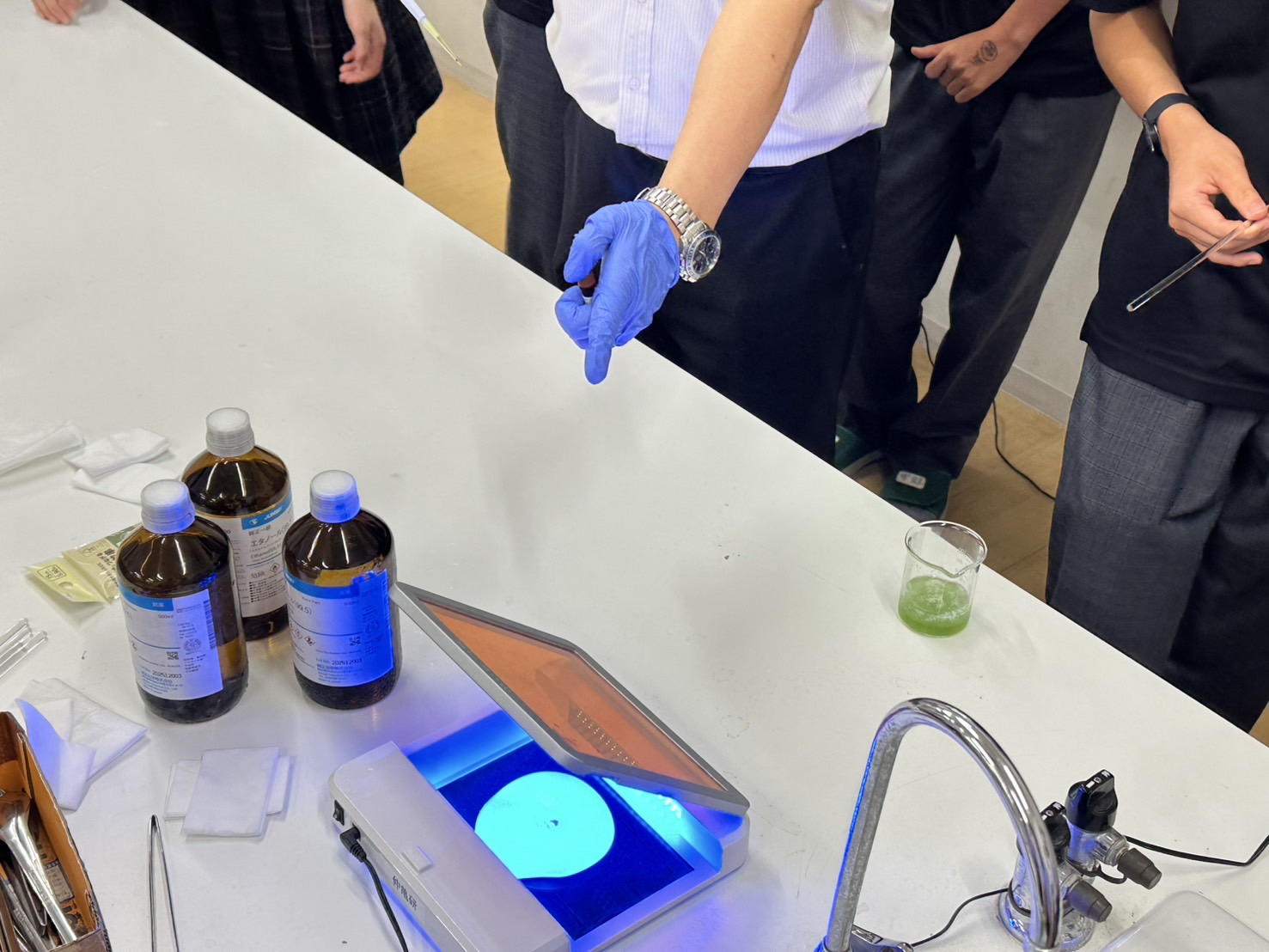 9月29日(月)、1年生の選抜補講では高大連携事業の一環として神奈川工科大学工学部応用化学生物学科の仲亀誠司教授をお招きし、DNAの抽出と検出に関する実験を行いました。今回のテーマは「生命の設計図であるDNAを見てみよう」というものでした。DNAは細胞の核内に存在し、通常は目に見えない物質ですが、今回はそのDNAを実際に抽出し、検出するという実験に挑戦しました。実験では、ブロッコリーを材料に、塩化ナトリウム・中性洗剤・エタノールを用いてDNAを抽出することを試みました。抽出したDNAに緑色の染色液を加え、UVランプを使って観察することで、DNAの存在を視覚的に確認することができました。生徒たちは実験に触れることで、生命科学への興味を深めるとともに、理系分野の学びの面白さを実感している様子でした。中亀教授の丁寧な解説と実験のサポートにより、科学の奥深さを体感できる貴重な時間となりました。