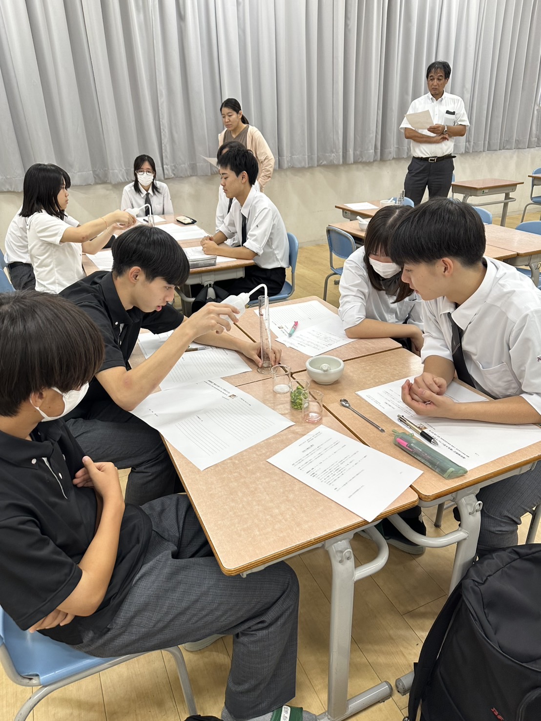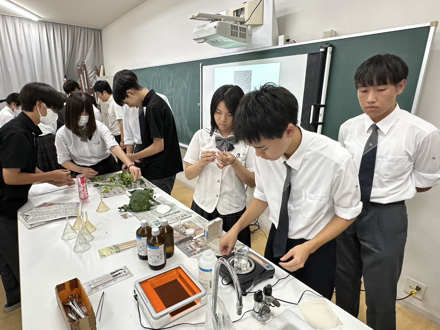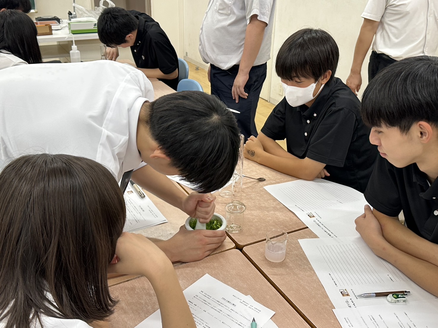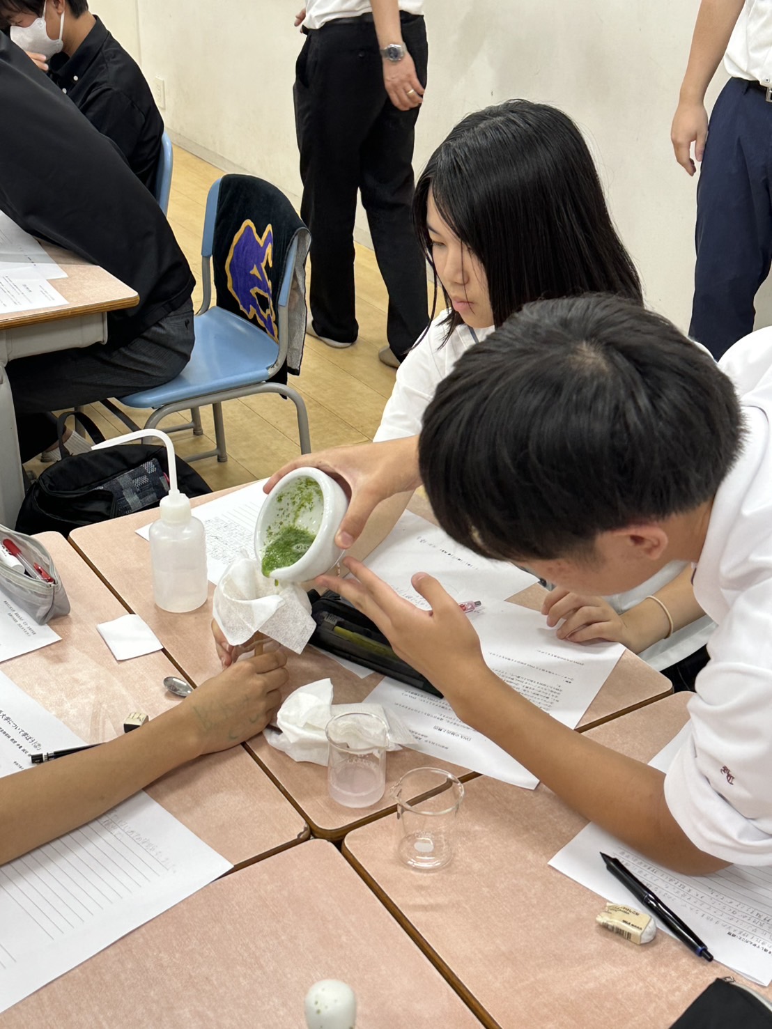 9月29日(月)、1年生の選抜補講では高大連携事業の一環として神奈川工科大学工学部応用化学生物学科の仲亀誠司教授をお招きし、DNAの抽出と検出に関する実験を行いました。今回のテーマは「生命の設計図であるDNAを見てみよう」というものでした。DNAは細胞の核内に存在し、通常は目に見えない物質ですが、今回はそのDNAを実際に抽出し、検出するという実験に挑戦しました。実験では、ブロッコリーを材料に、塩化ナトリウム・中性洗剤・エタノールを用いてDNAを抽出することを試みました。抽出したDNAに緑色の染色液を加え、UVランプを使って観察することで、DNAの存在を視覚的に確認することができました。生徒たちは実験に触れることで、生命科学への興味を深めるとともに、理系分野の学びの面白さを実感している様子でした。中亀教授の丁寧な解説と実験のサポートにより、科学の奥深さを体感できる貴重な時間となりました。