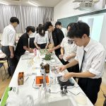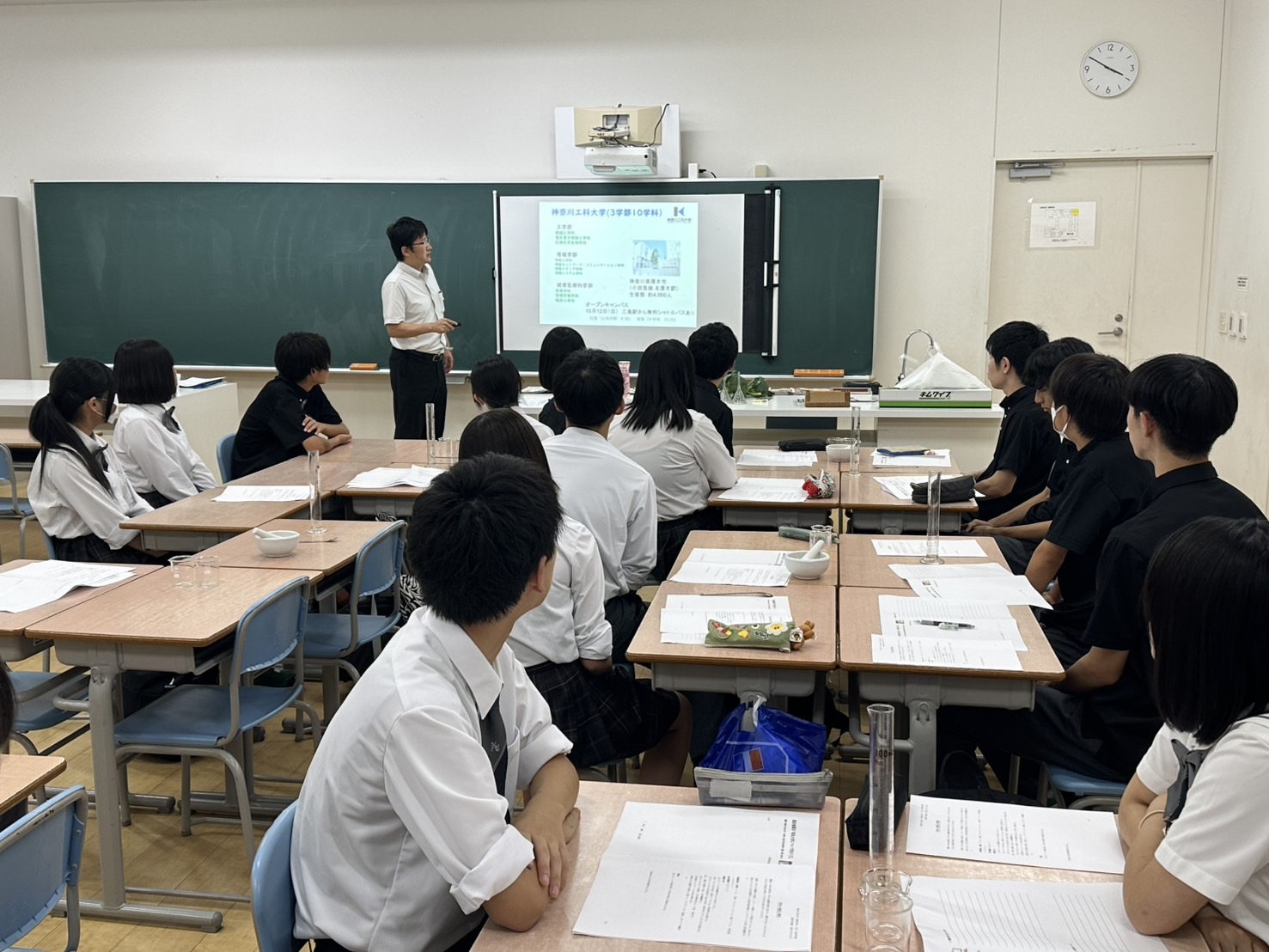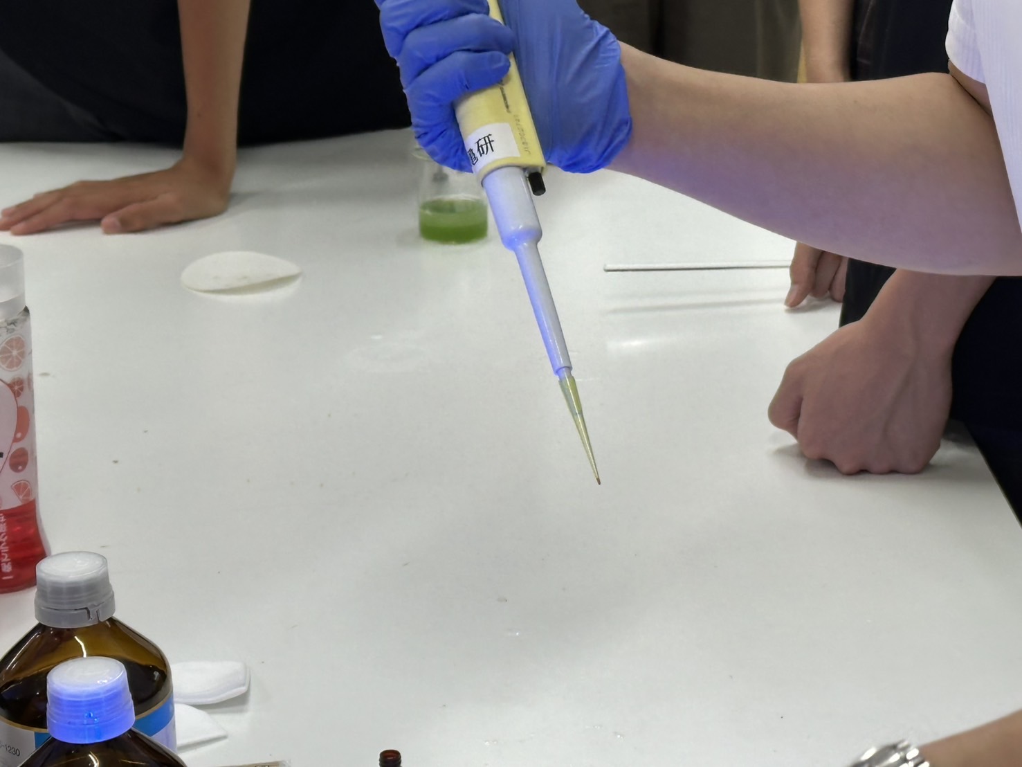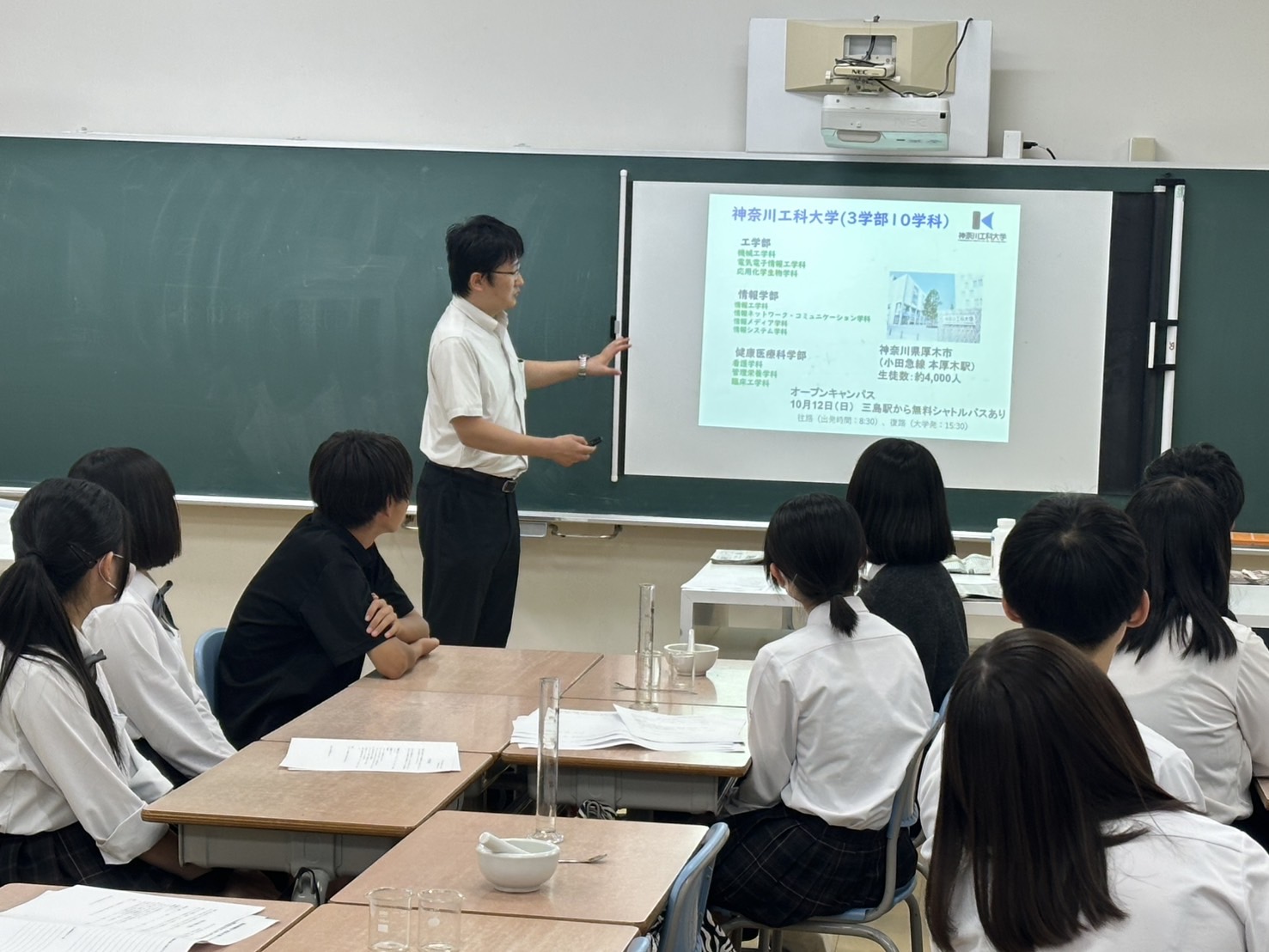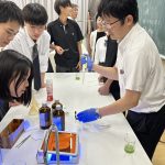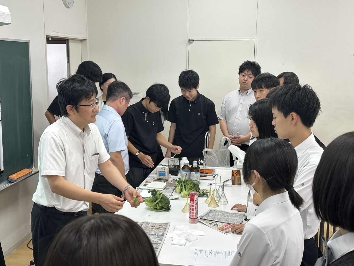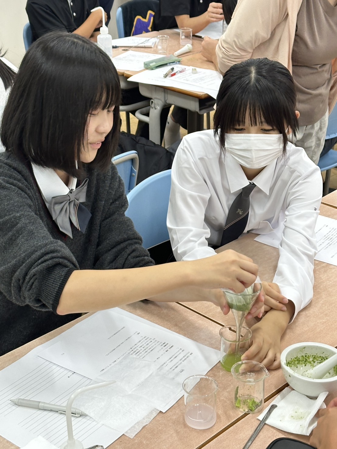 9月29日(月)、1年生の選抜補講では高大連携事業の一環として神奈川工科大学工学部応用化学生物学科の仲亀誠司教授をお招きし、DNAの抽出と検出に関する実験を行いました。今回のテーマは「生命の設計図であるDNAを見てみよう」というものでした。DNAは細胞の核内に存在し、通常は目に見えない物質ですが、今回はそのDNAを実際に抽出し、検出するという実験に挑戦しました。実験では、ブロッコリーを材料に、塩化ナトリウム・中性洗剤・エタノールを用いてDNAを抽出することを試みました。抽出したDNAに緑色の染色液を加え、UVランプを使って観察することで、DNAの存在を視覚的に確認することができました。生徒たちは実験に触れることで、生命科学への興味を深めるとともに、理系分野の学びの面白さを実感している様子でした。中亀教授の丁寧な解説と実験のサポートにより、科学の奥深さを体感できる貴重な時間となりました。