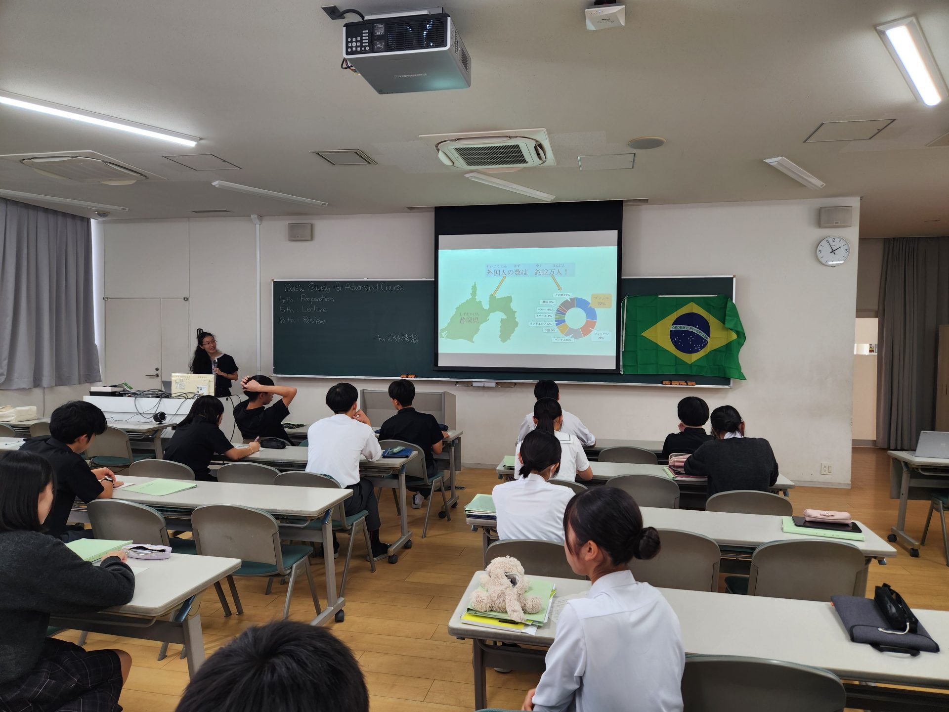 9月30日(火)、コース基礎の時間に、アドバンスコースの1年生を対象とした出前講座が行われました。今回は、ブラジル出身の国際交流員の方を講師としてお招きし、「ブラジルの暮らしと文化、経済と社会」について、実体験を交えながらご講義いただきました。講座では、ブラジルの多様な文化や生活習慣、教育制度、経済の特徴など、教科書ではなかなか知ることのできないリアルな情報が紹介され、生徒たちは興味深く耳を傾けていました。また、講師の方との質疑応答では、言語や食文化、国際交流の意義などについて活発なやりとりがあり、国際的な視野を広げる貴重な機会となりました。生徒たちにとって、異文化に触れることで自分の価値観を見つめ直し、将来の進路や学びへの意欲を高めるきっかけとなったようです。