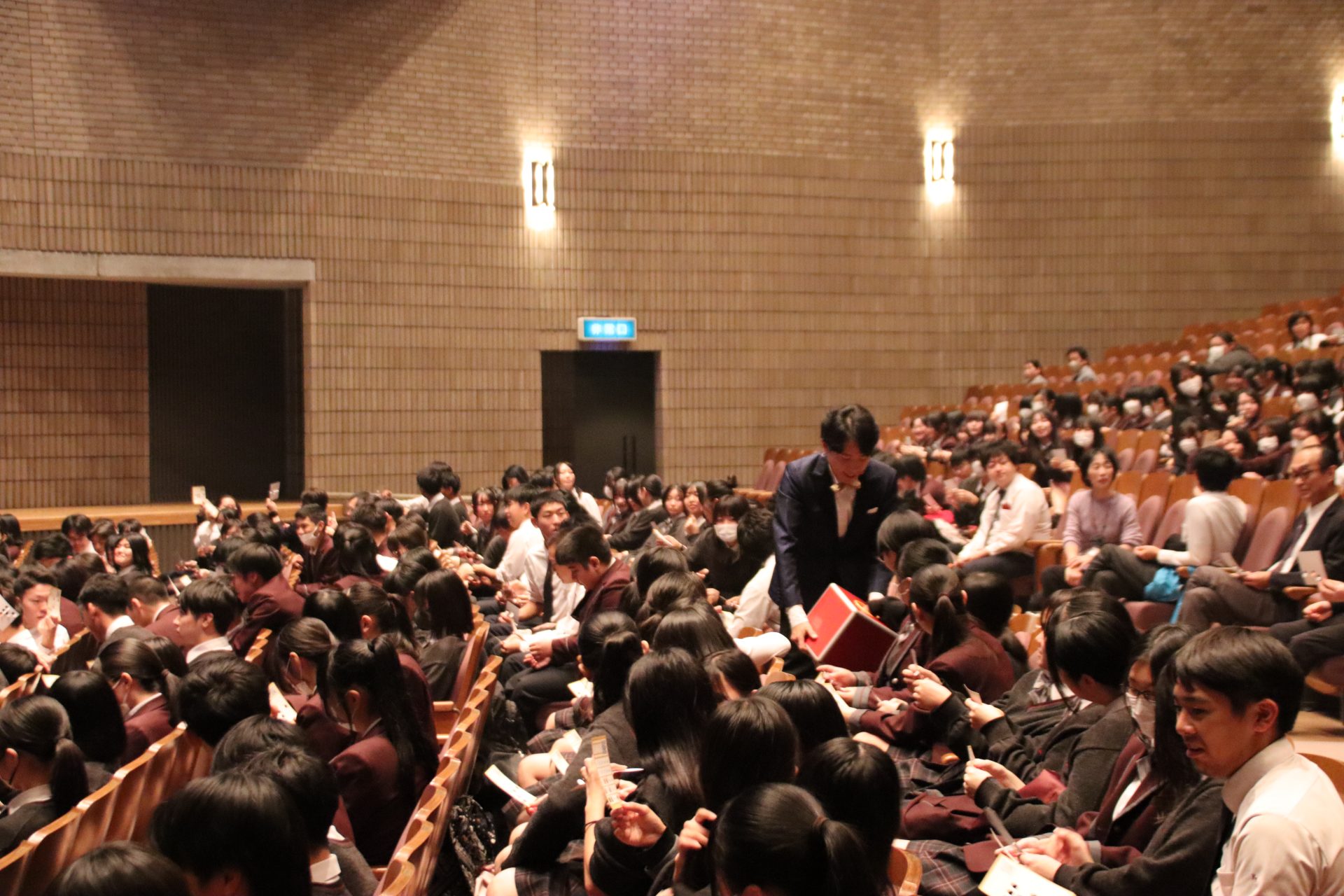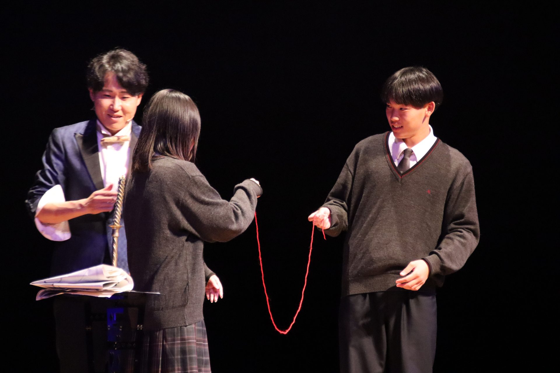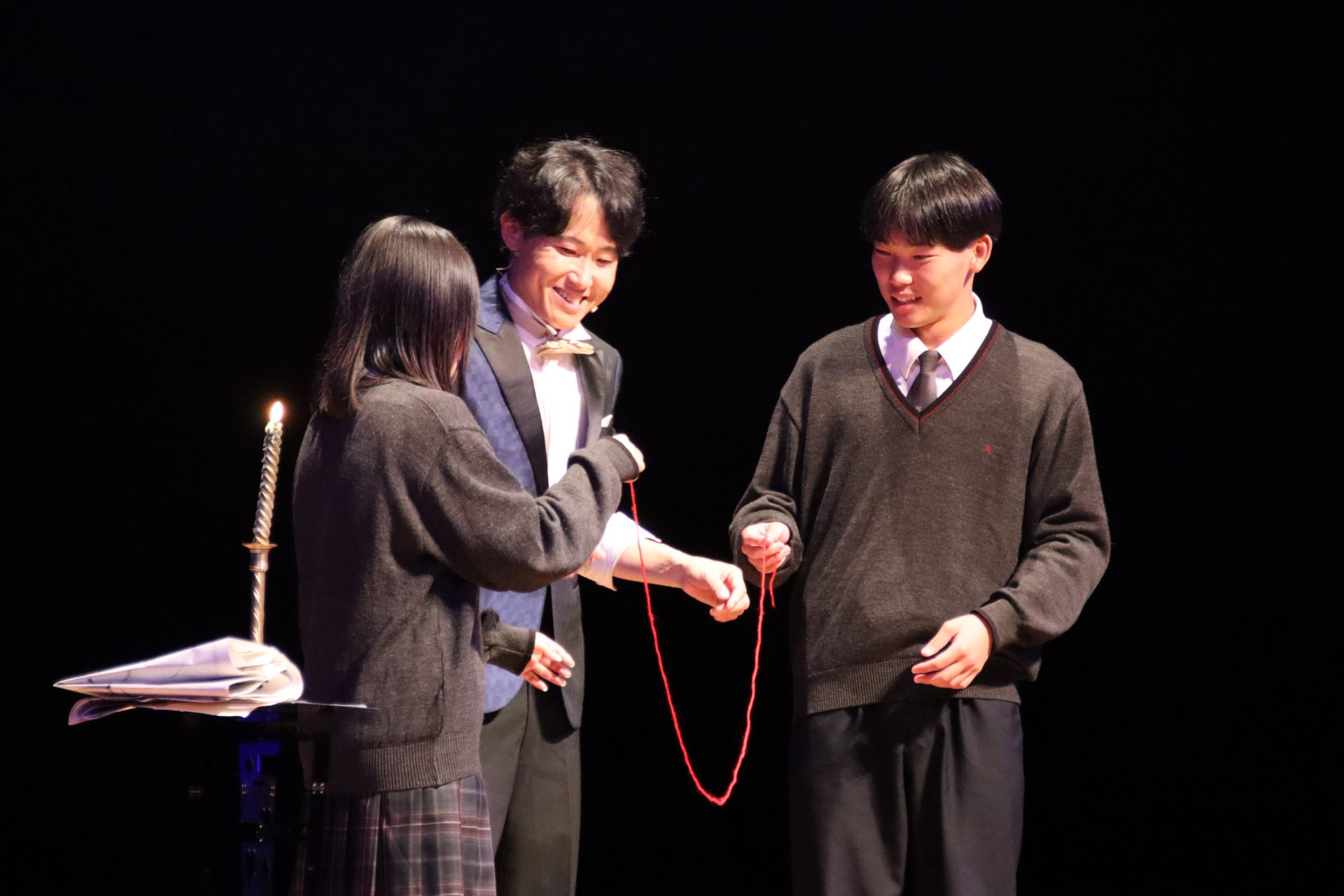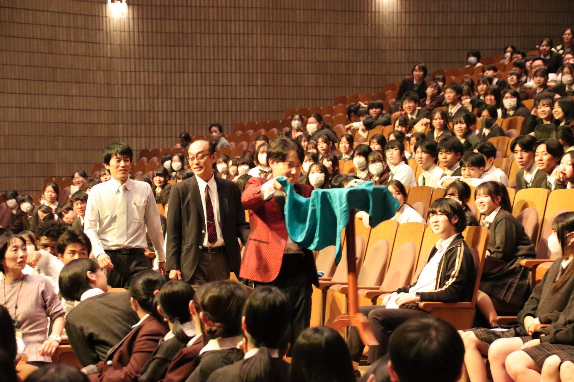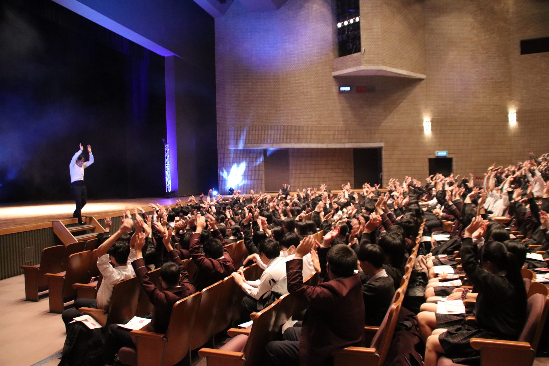 本校の芸術鑑賞会は講演、演劇、音楽を順に鑑賞しており、今年度は10月29日(水)に沼津市民文化センターで、いま最も注目されている若手No.1イリュージョニストDAIKIさんによる新時代の体験型ファンタスティック・イリュージョン・マジックを鑑賞しました。国内外で数々の賞を受賞し、年間300ステージ以上をこなすDAIKIさんのステージは生徒が参加できる体験型のマジックも盛り込まれ、目の前で繰り広げられる奇跡の連続に、会場の生徒たちは驚きと歓喜の声を上げました。次々と展開されるダイナミックで洗練されたイリュージョンに魅了されっぱなしの90分でした。生徒会長の村山悠晴君(長泉中出身)は「驚きと感動の連続でした。目の前で起こっていることなのに、仕組みが全く分からない。DAIKIさんの世界観に引き込まれ、非日常の体験ができました。この集中力や創造性を、自分たちの学校生活にも活かしていきたいです」と感想を述べてくれました。一流の芸術に触れることで、感性を刺激されるとともに、創造力や探求心を深める貴重な一日となりました。
