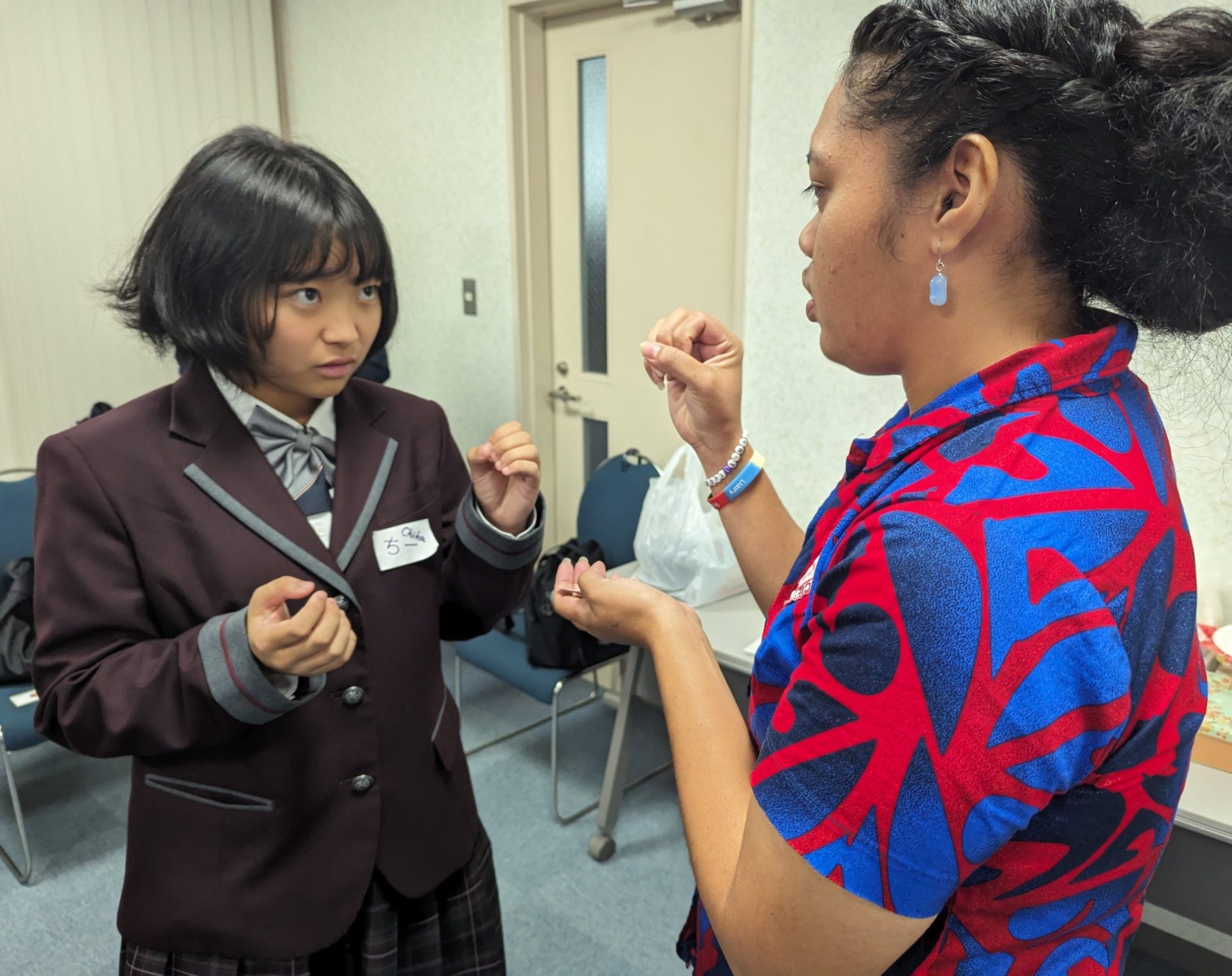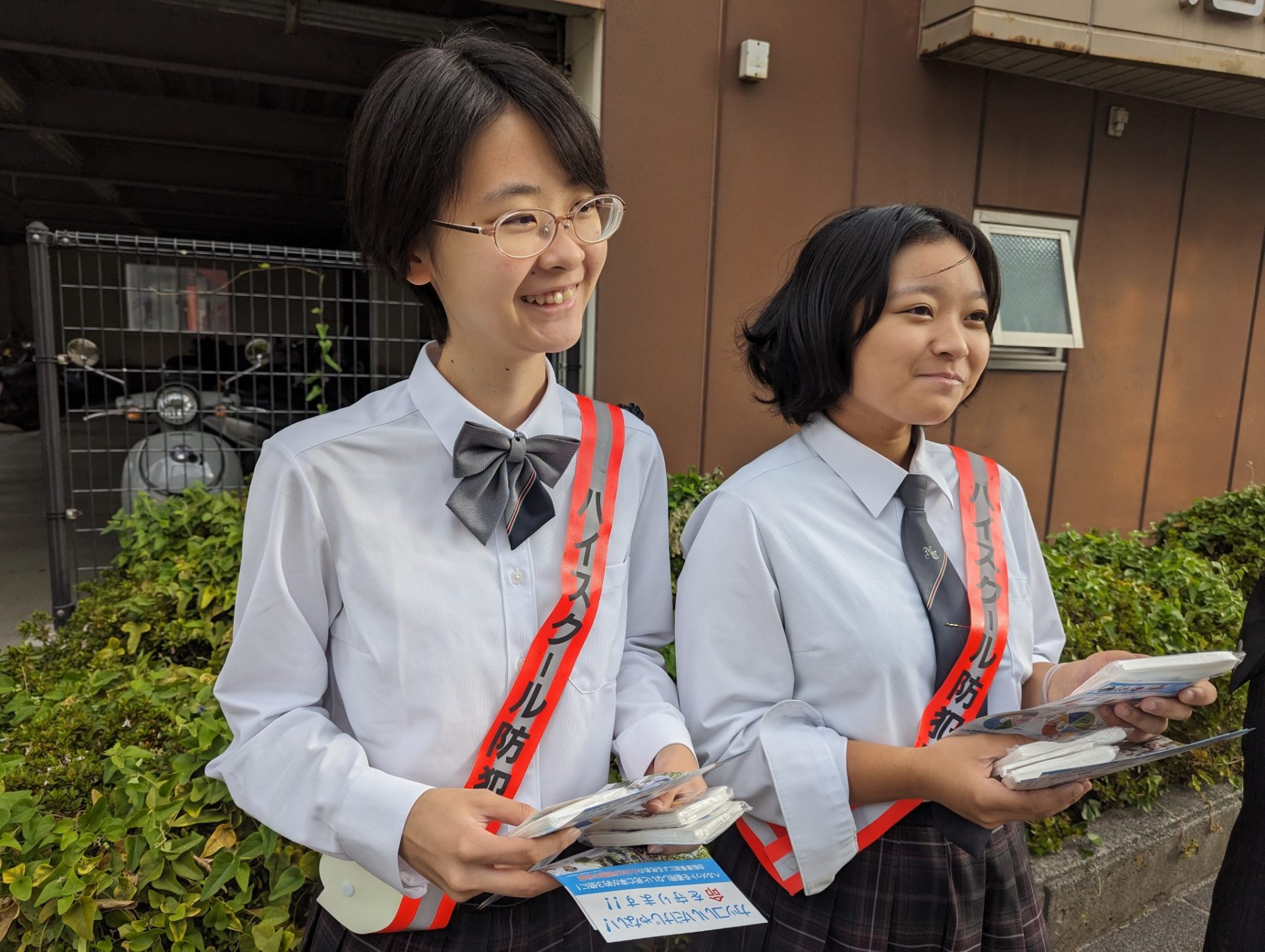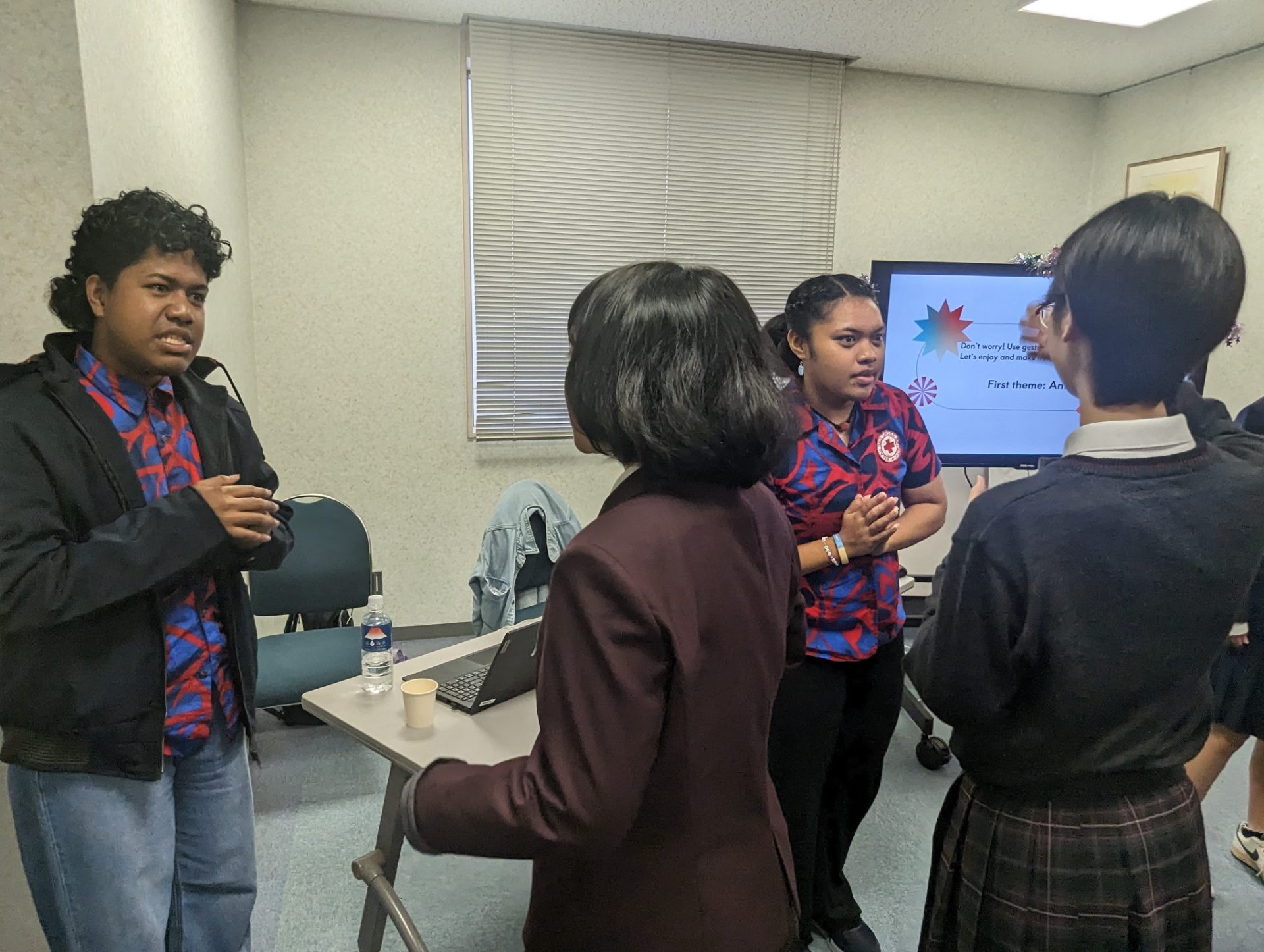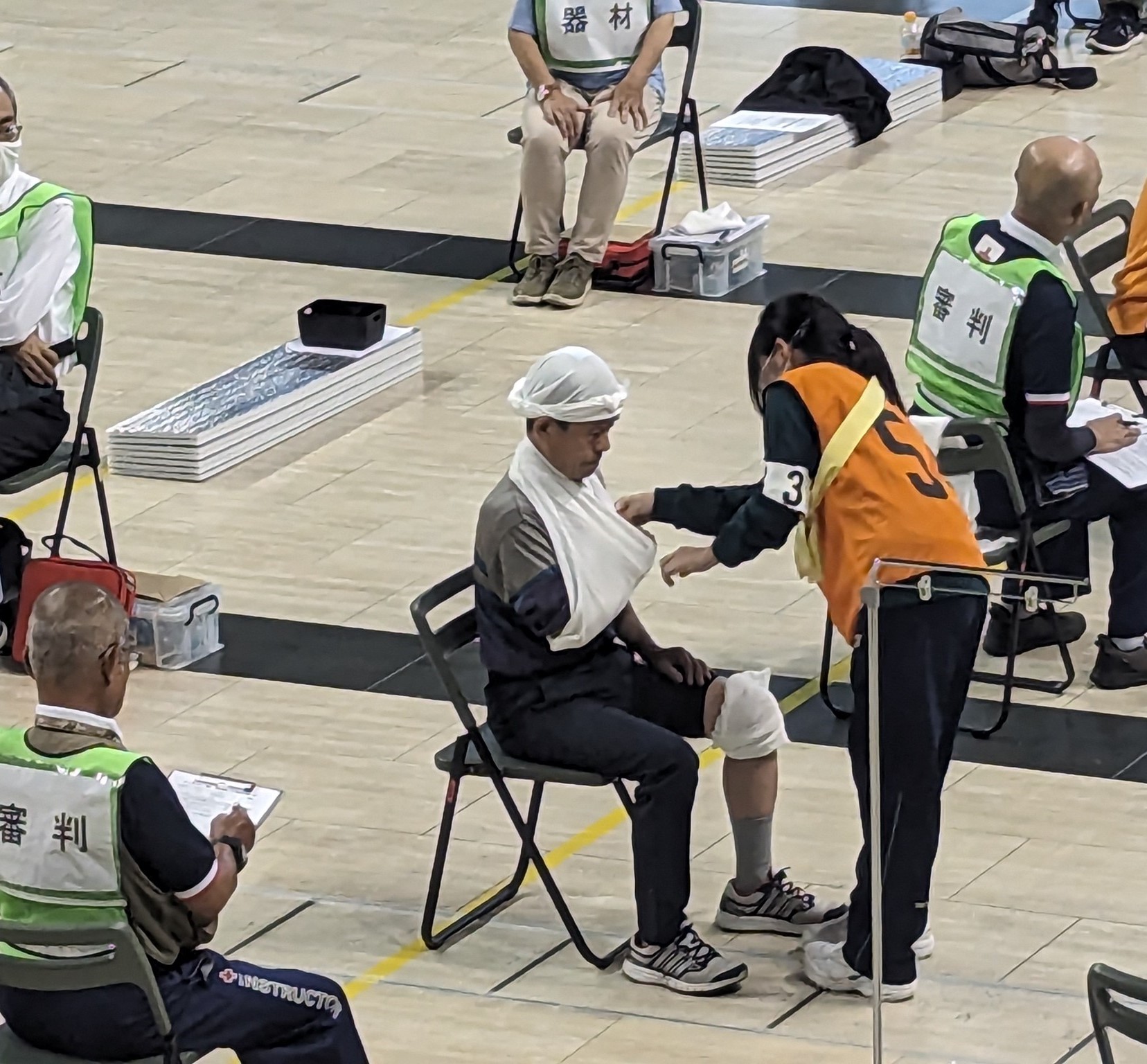 インターアクト部は10月4日(土)に赤十字救急法競技会に参加しました。初参加となりましたが、三角巾による傷の手当てやAEDの使い方などを習得するよい機会となりました。競技会に参加した2年生の野秋奈央さん(中郷中出身)は「三角巾の結び方は、ただ手当するだけでなく、その後の搬送や生活のしやすさなども考える必要があることを学びました。本番の傷病部位は自分が苦手とする頭だったのですが、きれいにできて良かったです」と話してくれました。また、10月10日(金)は「自転車安全総合対策キャンペーン」にてツーロック推奨やヘルメット着用等の声掛け運動、10月26日(日)には青少年赤十字国際交流としてパラオから来日したメンバーとの交流会がありました。パラオの紹介をしていただき、英語を駆使しながら積極的に交流を図ることができました。今後も地域内外の活動に積極的に参加し、視野を広げていきたいと思います。