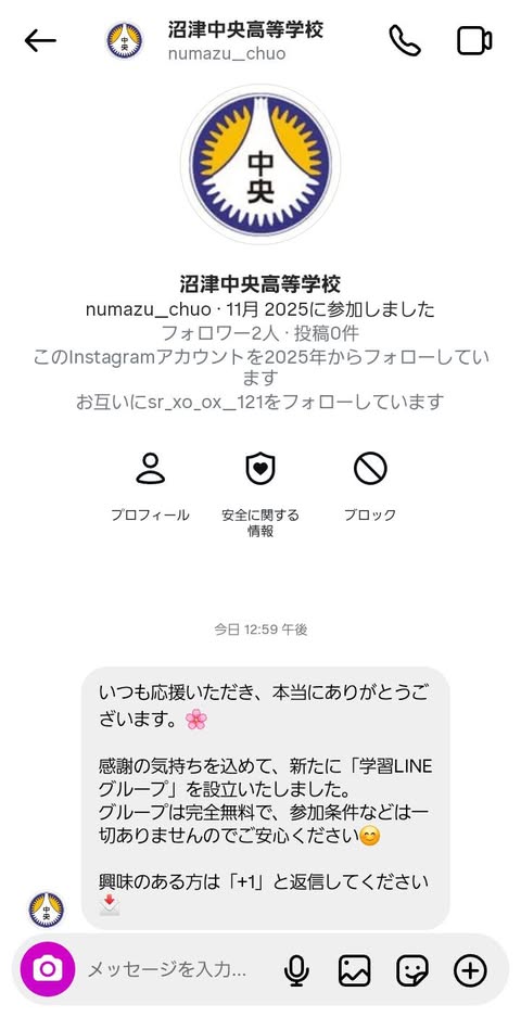 12月2日現在、このような状況を把握し、その後関係機関と連携し、然るべき措置で対処いたします。万が一、公式アカウント以外から不審なコメントやDMを受け取った場合は、記載のURL等にはアクセスせずDMは消去し、被害防止のため偽アカウントはブロックするなどの対応をしていただきますようお願いいたします。なお、沼津中央高等学校の公式InstagramアカウントからDMを送ることは一切ありませんので、ご注意ください。