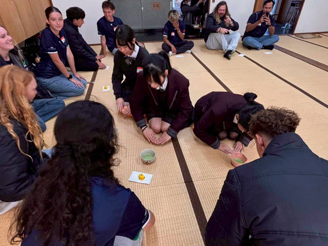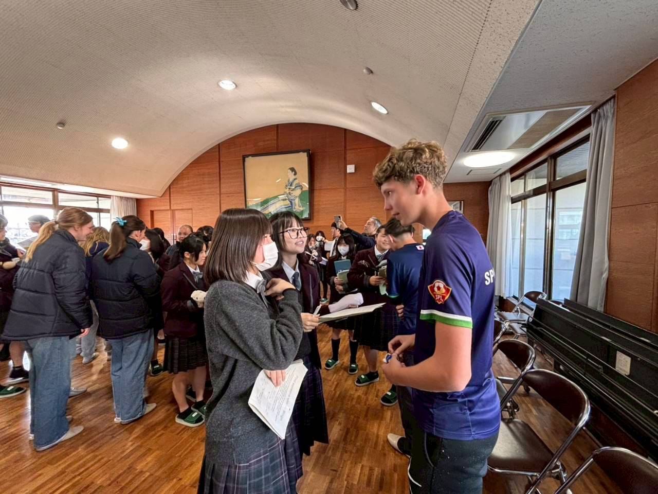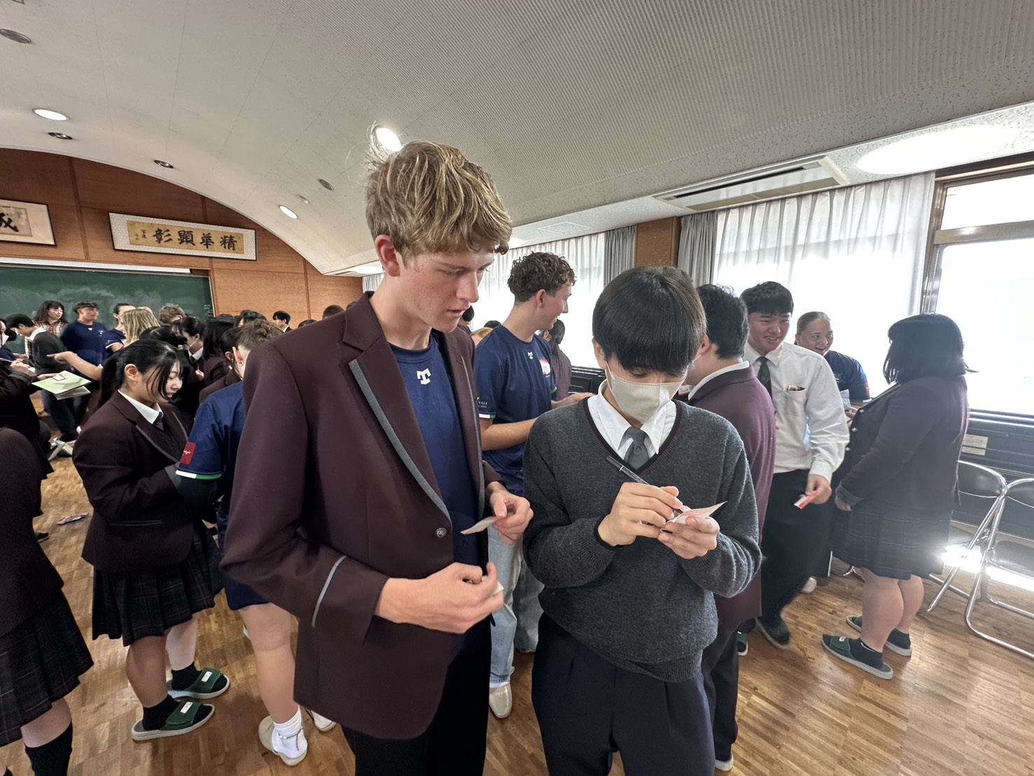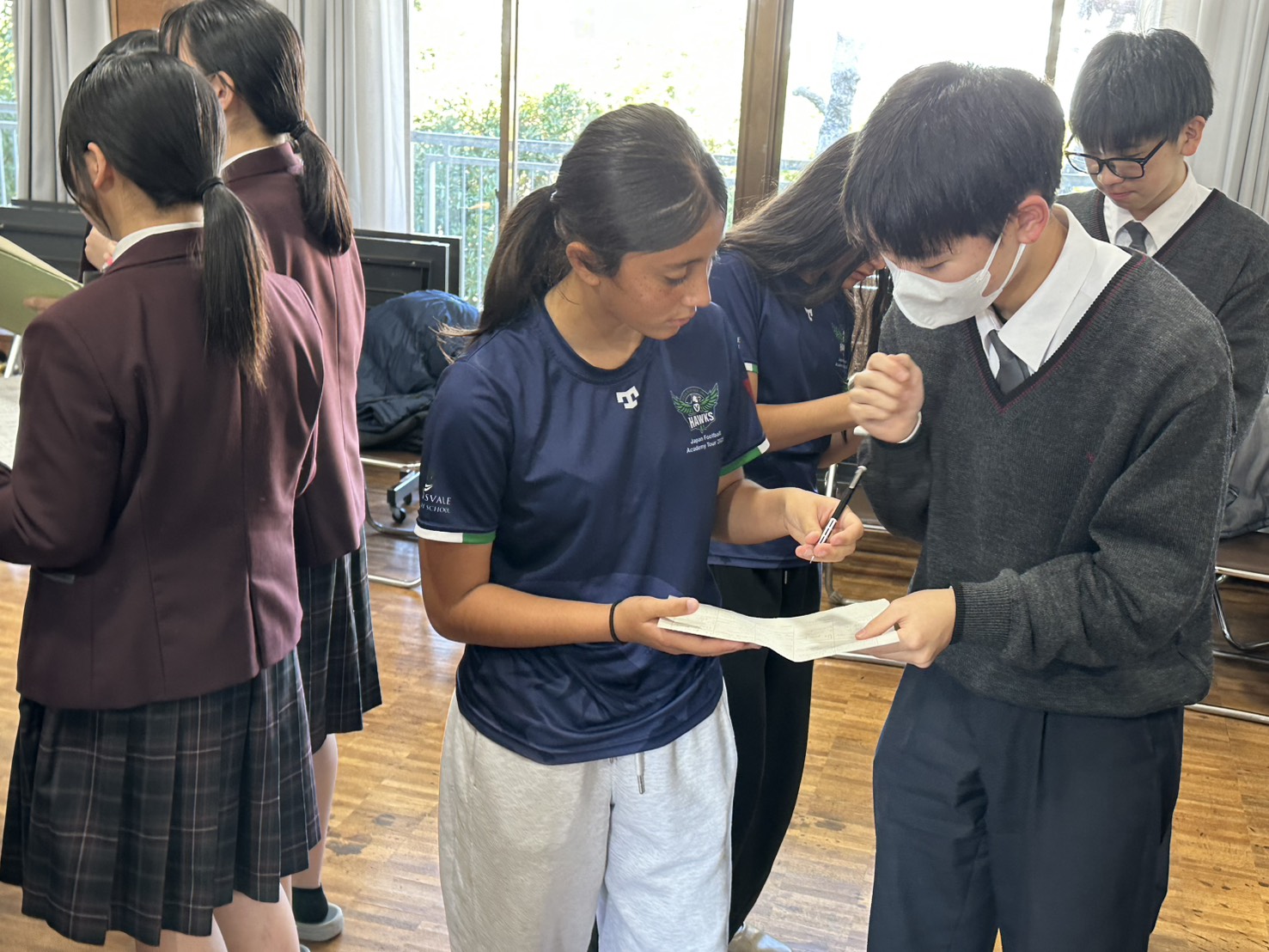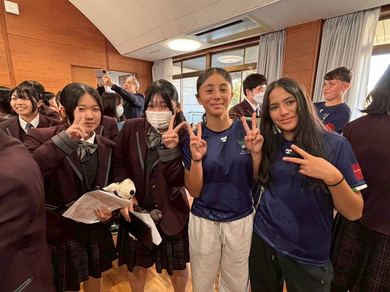 コロナ禍以降、初めての国際交流はオーストラリアの学校とのサッカー交流となりました。今回の交流は、6年前にも同じマネジメント会社を通じて行った国際交流の再開となりました。まず、12月5日(金)の夕方にPalm Beach高校のU16サッカーチームと時之栖裾野グラウンドで交流試合を行いました。気温4℃という寒さの中、両校の選手たちは全力でプレーし、試合後にはユニフォームやギフトを交換して親睦を深めました。翌週の12月8日(月)には、Helensvale State High Schoolの生徒が昼前から本校を訪れ、4限目の授業から放課後の部活動体験まで、さまざまな活動を通じて本校生徒と交流しました。多くの生徒がオーストラリアの高校生からプレゼントを受け取り、笑顔があふれる時間となりました。放課後の部活動では、吹奏楽部、茶道部、華道部、大正琴同好会の生徒たちが、オーストラリアの高校生らを温かく迎え、日本文化の体験をサポートしました。吹奏楽部による演奏体験では、楽器の音色や演奏方法を紹介し、音楽を通じた交流が生まれました。茶道部と華道部では、日本ならではの「おもてなしの心」を感じられる体験を提供し、茶を点てる所作や花を生ける美しさに、オーストラリアの生徒たちは興味津々の様子でした。さらに、大正琴同好会では、伝統楽器の音色に触れながら、実際に弾いてみる体験も行われ、笑顔と驚きがあふれる時間となりました。こうした文化交流を通じて、言葉の壁を越えたコミュニケーションが生まれ、生徒たちにとっても貴重な国際交流の機会となりました。12月9日(火)には、前日に交流したHelensvale高校のU16サッカーチームと裾野グラウンドで試合を行いました。顔見知りになったことで、試合後の交流はより楽しく、互いに名前入りのウェアを交換しながら別れを惜しむ姿が見られました。今回の交流を通じて、「もっと英語を話せたら、もっと仲良くなれたのに」という前向きな気持ちが本校生徒に芽生えました。この経験を、今後の英語学習への意欲につなげてほしいと思います。
