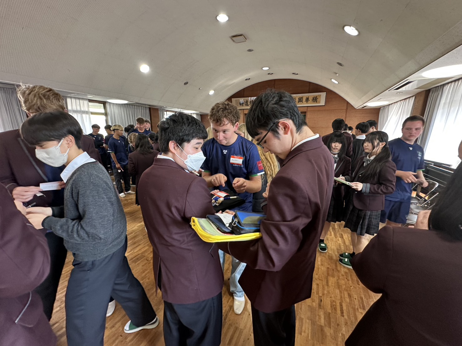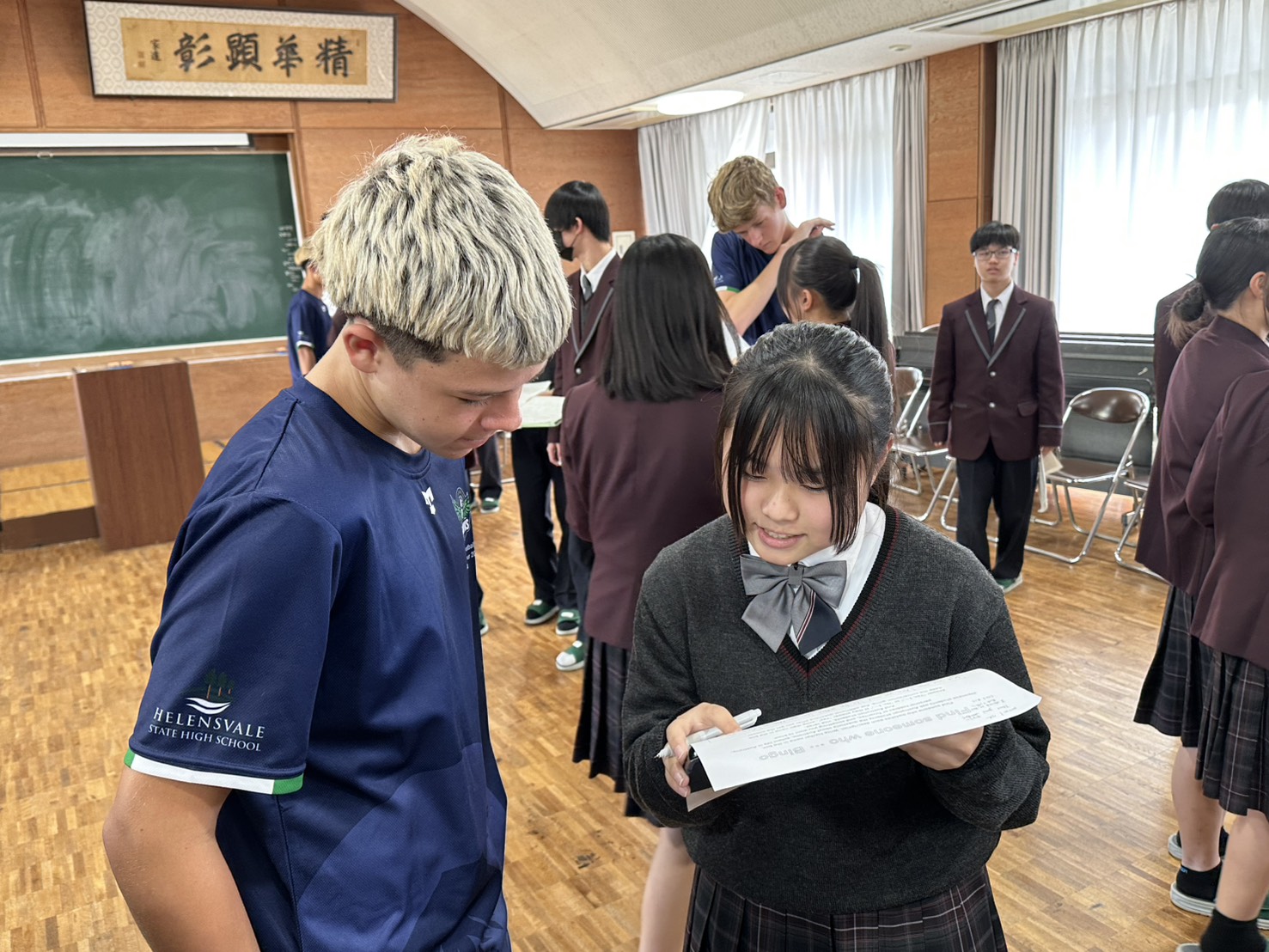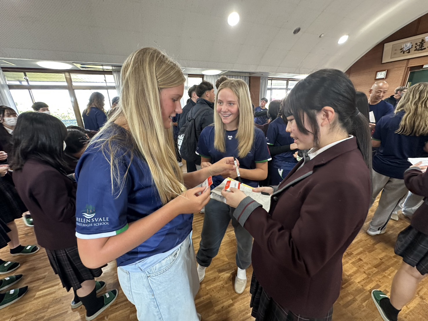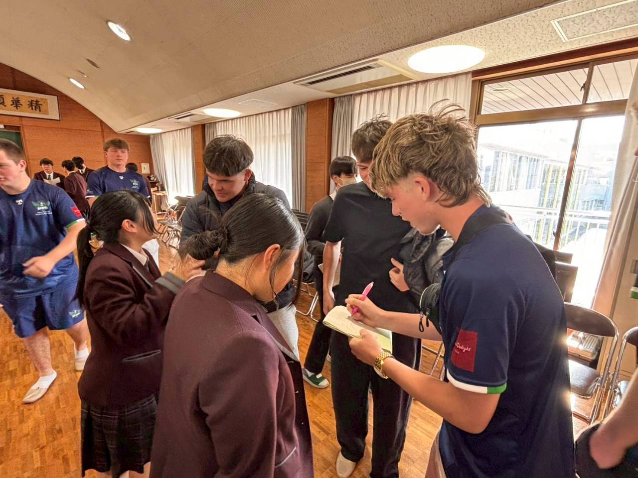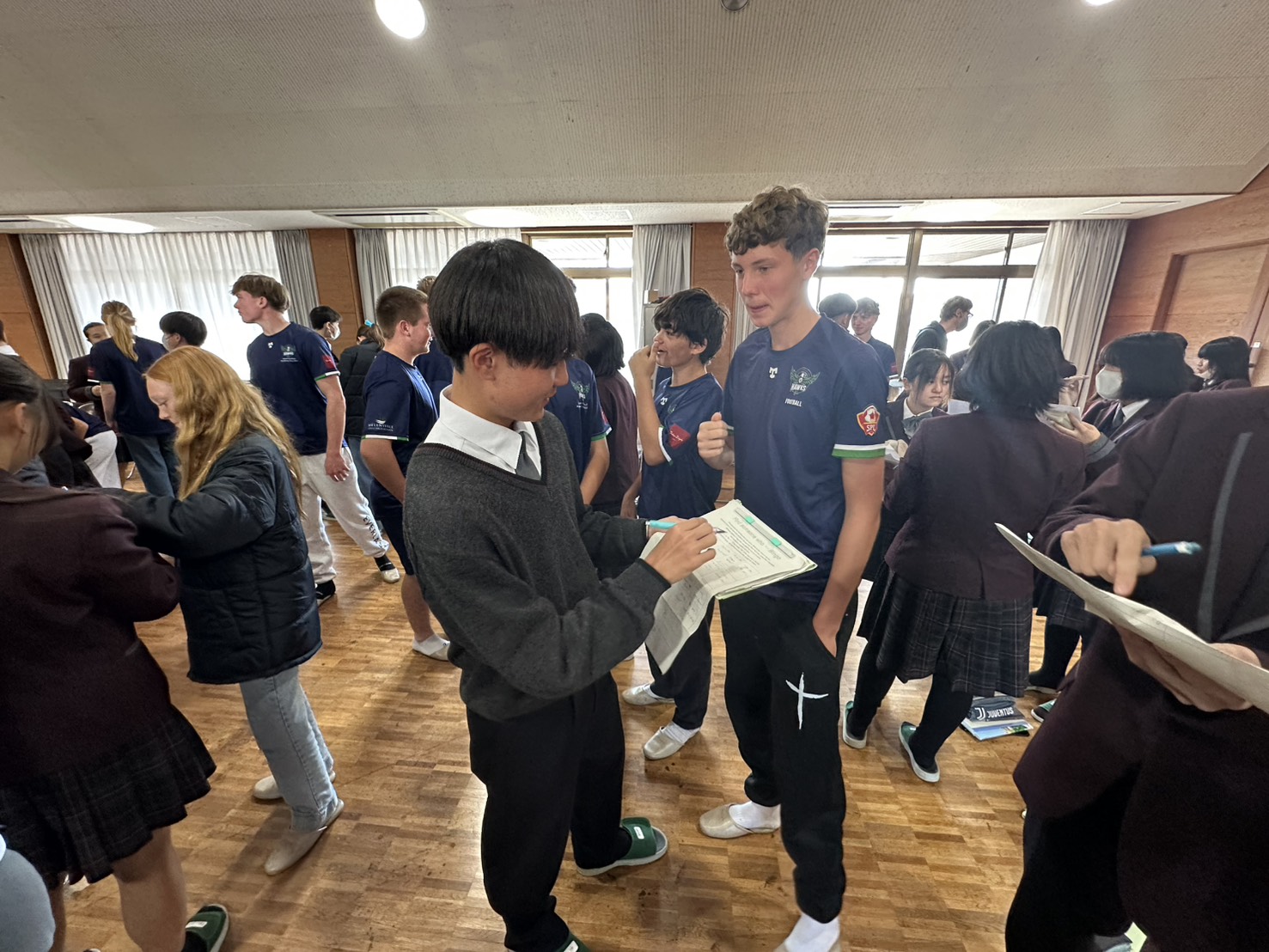 コロナ禍以降、初めての国際交流はオーストラリアの学校とのサッカー交流となりました。今回の交流は、6年前にも同じマネジメント会社を通じて行った国際交流の再開となりました。まず、12月5日(金)の夕方にPalm Beach高校のU16サッカーチームと時之栖裾野グラウンドで交流試合を行いました。気温4℃という寒さの中、両校の選手たちは全力でプレーし、試合後にはユニフォームやギフトを交換して親睦を深めました。翌週の12月8日(月)には、Helensvale State High Schoolの生徒が昼前から本校を訪れ、4限目の授業から放課後の部活動体験まで、さまざまな活動を通じて本校生徒と交流しました。多くの生徒がオーストラリアの高校生からプレゼントを受け取り、笑顔があふれる時間となりました。放課後の部活動では、吹奏楽部、茶道部、華道部、大正琴同好会の生徒たちが、オーストラリアの高校生らを温かく迎え、日本文化の体験をサポートしました。吹奏楽部による演奏体験では、楽器の音色や演奏方法を紹介し、音楽を通じた交流が生まれました。茶道部と華道部では、日本ならではの「おもてなしの心」を感じられる体験を提供し、茶を点てる所作や花を生ける美しさに、オーストラリアの生徒たちは興味津々の様子でした。さらに、大正琴同好会では、伝統楽器の音色に触れながら、実際に弾いてみる体験も行われ、笑顔と驚きがあふれる時間となりました。こうした文化交流を通じて、言葉の壁を越えたコミュニケーションが生まれ、生徒たちにとっても貴重な国際交流の機会となりました。12月9日(火)には、前日に交流したHelensvale高校のU16サッカーチームと裾野グラウンドで試合を行いました。顔見知りになったことで、試合後の交流はより楽しく、互いに名前入りのウェアを交換しながら別れを惜しむ姿が見られました。今回の交流を通じて、「もっと英語を話せたら、もっと仲良くなれたのに」という前向きな気持ちが本校生徒に芽生えました。この経験を、今後の英語学習への意欲につなげてほしいと思います。