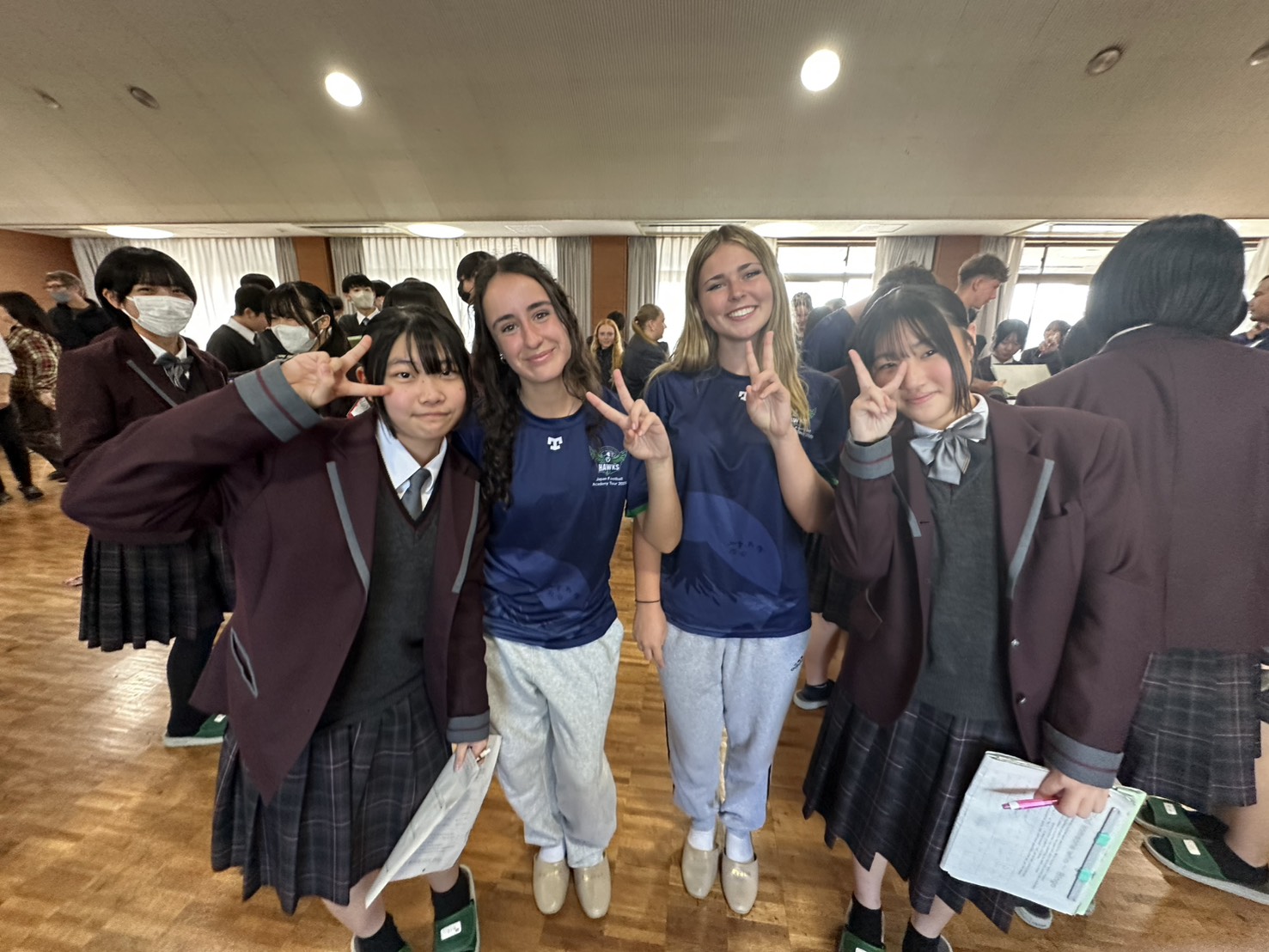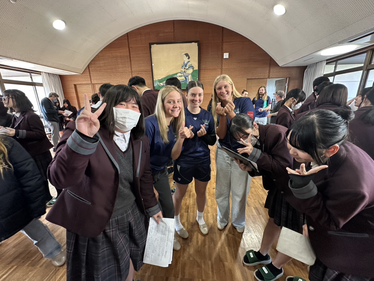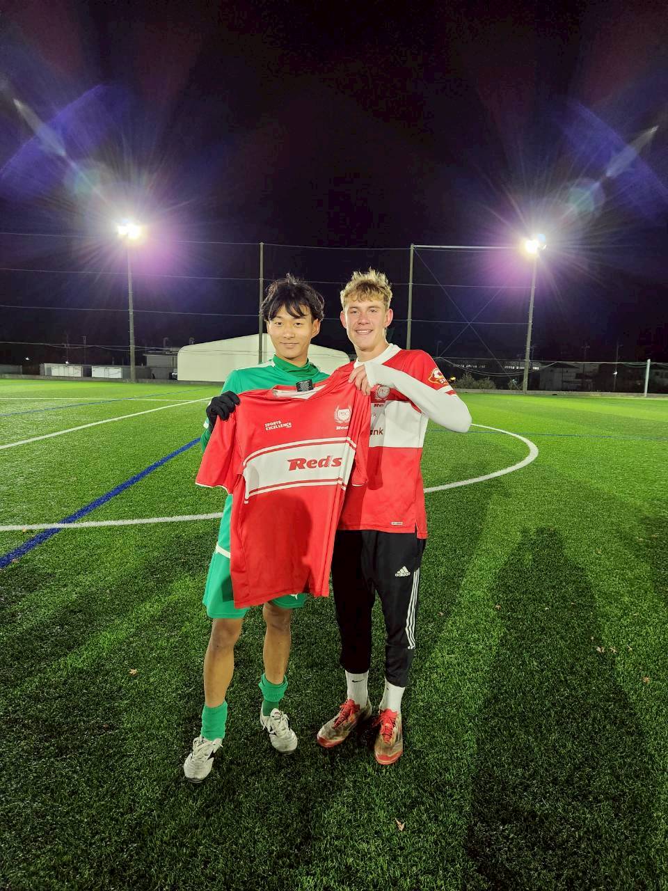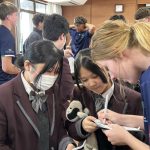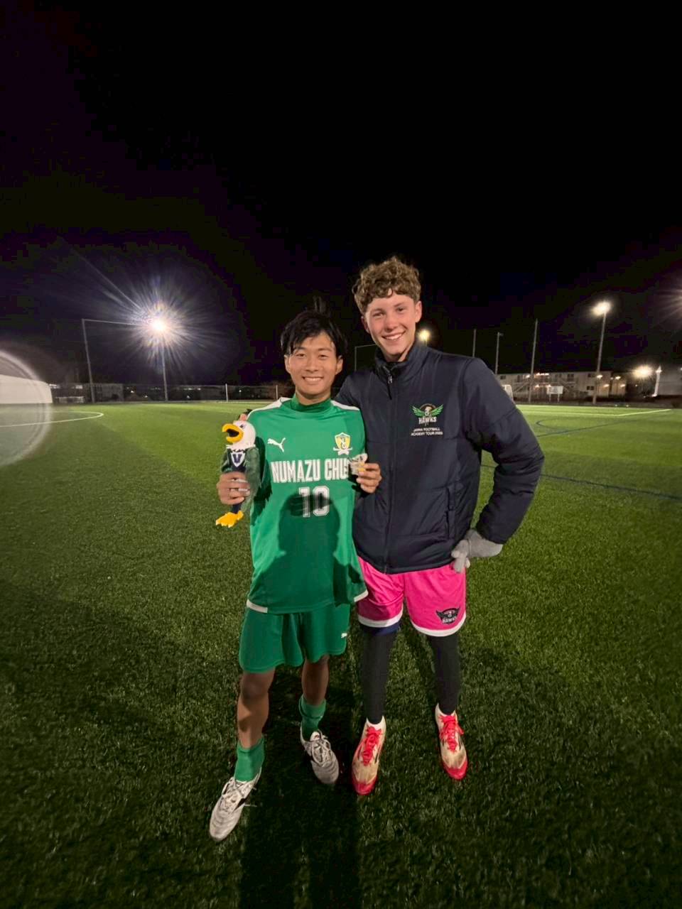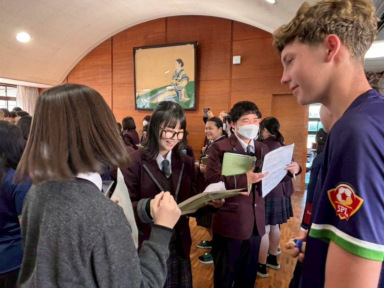 コロナ禍以降、初めての国際交流はオーストラリアの学校とのサッカー交流となりました。今回の交流は、6年前にも同じマネジメント会社を通じて行った国際交流の再開となりました。まず、12月5日(金)の夕方にPalm Beach高校のU16サッカーチームと時之栖裾野グラウンドで交流試合を行いました。気温4℃という寒さの中、両校の選手たちは全力でプレーし、試合後にはユニフォームやギフトを交換して親睦を深めました。翌週の12月8日(月)には、Helensvale State High Schoolの生徒が昼前から本校を訪れ、4限目の授業から放課後の部活動体験まで、さまざまな活動を通じて本校生徒と交流しました。多くの生徒がオーストラリアの高校生からプレゼントを受け取り、笑顔があふれる時間となりました。放課後の部活動では、吹奏楽部、茶道部、華道部、大正琴同好会の生徒たちが、オーストラリアの高校生らを温かく迎え、日本文化の体験をサポートしました。吹奏楽部による演奏体験では、楽器の音色や演奏方法を紹介し、音楽を通じた交流が生まれました。茶道部と華道部では、日本ならではの「おもてなしの心」を感じられる体験を提供し、茶を点てる所作や花を生ける美しさに、オーストラリアの生徒たちは興味津々の様子でした。さらに、大正琴同好会では、伝統楽器の音色に触れながら、実際に弾いてみる体験も行われ、笑顔と驚きがあふれる時間となりました。こうした文化交流を通じて、言葉の壁を越えたコミュニケーションが生まれ、生徒たちにとっても貴重な国際交流の機会となりました。12月9日(火)には、前日に交流したHelensvale高校のU16サッカーチームと裾野グラウンドで試合を行いました。顔見知りになったことで、試合後の交流はより楽しく、互いに名前入りのウェアを交換しながら別れを惜しむ姿が見られました。今回の交流を通じて、「もっと英語を話せたら、もっと仲良くなれたのに」という前向きな気持ちが本校生徒に芽生えました。この経験を、今後の英語学習への意欲につなげてほしいと思います。