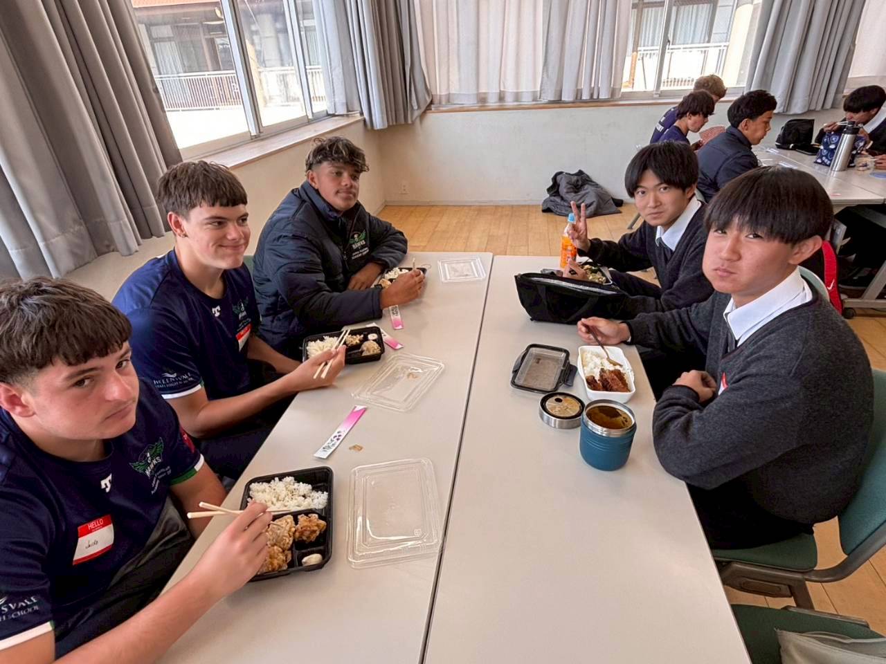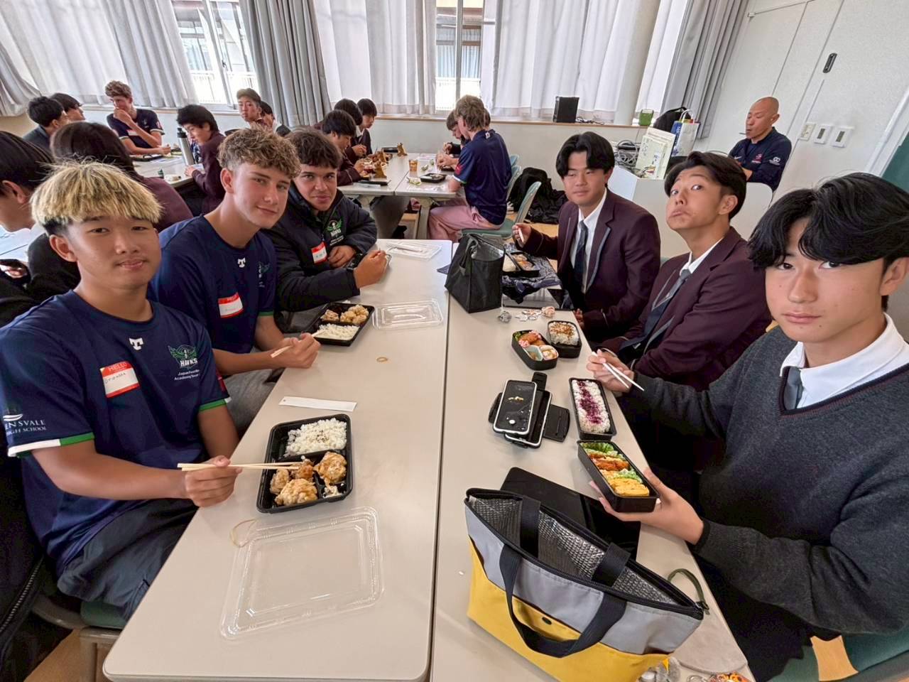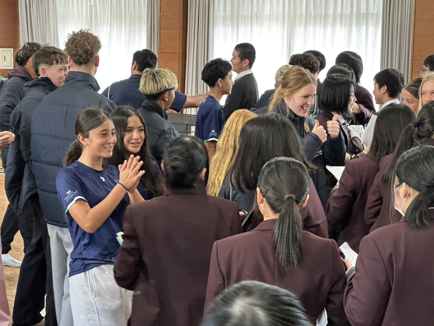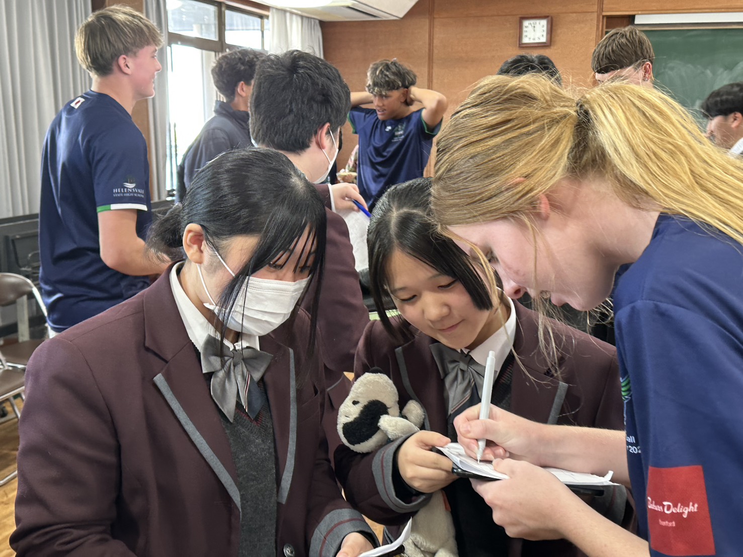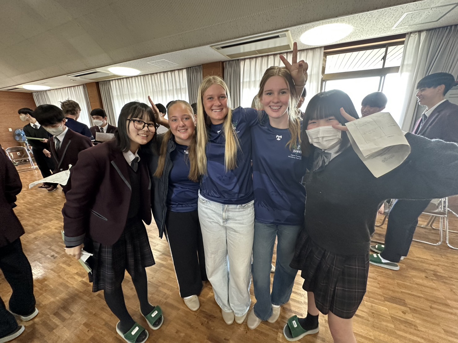 コロナ禍以降、初めての国際交流はオーストラリアの学校とのサッカー交流となりました。今回の交流は、6年前にも同じマネジメント会社を通じて行った国際交流の再開となりました。まず、12月5日(金)の夕方にPalm Beach高校のU16サッカーチームと時之栖裾野グラウンドで交流試合を行いました。気温4℃という寒さの中、両校の選手たちは全力でプレーし、試合後にはユニフォームやギフトを交換して親睦を深めました。翌週の12月8日(月)には、Helensvale State High Schoolの生徒が昼前から本校を訪れ、4限目の授業から放課後の部活動体験まで、さまざまな活動を通じて本校生徒と交流しました。多くの生徒がオーストラリアの高校生からプレゼントを受け取り、笑顔があふれる時間となりました。放課後の部活動では、吹奏楽部、茶道部、華道部、大正琴同好会の生徒たちが、オーストラリアの高校生らを温かく迎え、日本文化の体験をサポートしました。吹奏楽部による演奏体験では、楽器の音色や演奏方法を紹介し、音楽を通じた交流が生まれました。茶道部と華道部では、日本ならではの「おもてなしの心」を感じられる体験を提供し、茶を点てる所作や花を生ける美しさに、オーストラリアの生徒たちは興味津々の様子でした。さらに、大正琴同好会では、伝統楽器の音色に触れながら、実際に弾いてみる体験も行われ、笑顔と驚きがあふれる時間となりました。こうした文化交流を通じて、言葉の壁を越えたコミュニケーションが生まれ、生徒たちにとっても貴重な国際交流の機会となりました。12月9日(火)には、前日に交流したHelensvale高校のU16サッカーチームと裾野グラウンドで試合を行いました。顔見知りになったことで、試合後の交流はより楽しく、互いに名前入りのウェアを交換しながら別れを惜しむ姿が見られました。今回の交流を通じて、「もっと英語を話せたら、もっと仲良くなれたのに」という前向きな気持ちが本校生徒に芽生えました。この経験を、今後の英語学習への意欲につなげてほしいと思います。