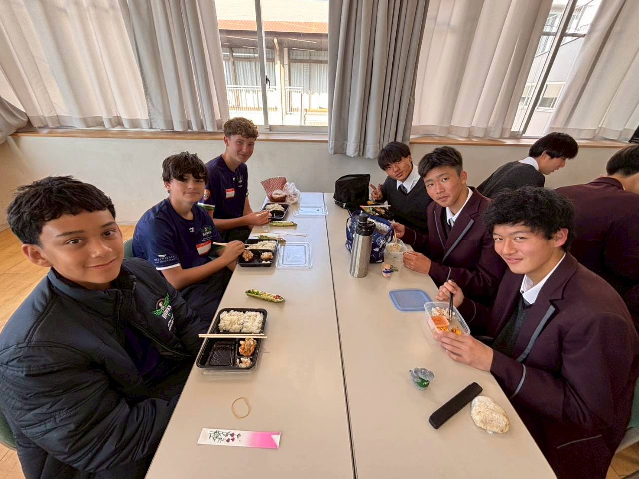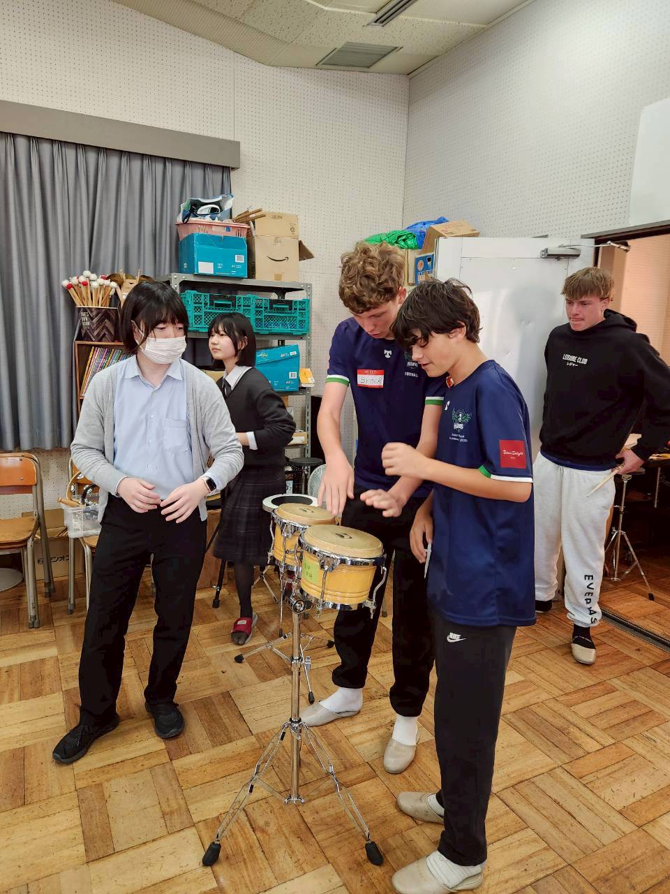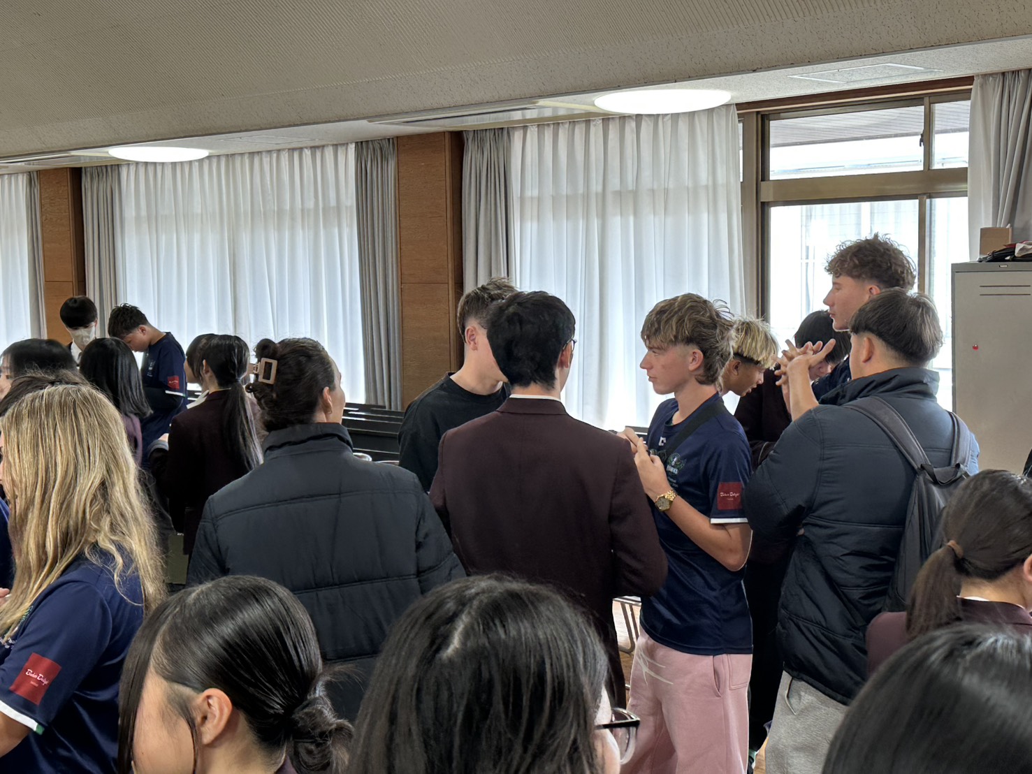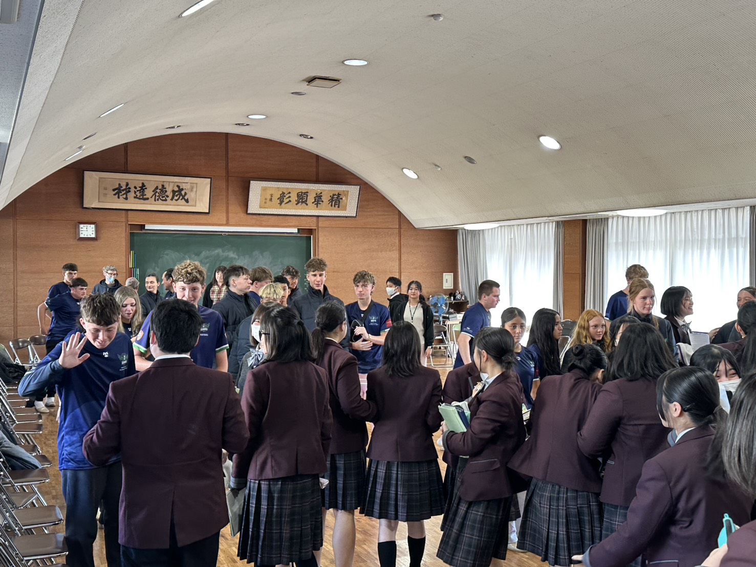 コロナ禍以降、初めての国際交流はオーストラリアの学校とのサッカー交流となりました。今回の交流は、6年前にも同じマネジメント会社を通じて行った国際交流の再開となりました。まず、12月5日(金)の夕方にPalm Beach高校のU16サッカーチームと時之栖裾野グラウンドで交流試合を行いました。気温4℃という寒さの中、両校の選手たちは全力でプレーし、試合後にはユニフォームやギフトを交換して親睦を深めました。翌週の12月8日(月)には、Helensvale State High Schoolの生徒が昼前から本校を訪れ、4限目の授業から放課後の部活動体験まで、さまざまな活動を通じて本校生徒と交流しました。多くの生徒がオーストラリアの高校生からプレゼントを受け取り、笑顔があふれる時間となりました。放課後の部活動では、吹奏楽部、茶道部、華道部、大正琴同好会の生徒たちが、オーストラリアの高校生らを温かく迎え、日本文化の体験をサポートしました。吹奏楽部による演奏体験では、楽器の音色や演奏方法を紹介し、音楽を通じた交流が生まれました。茶道部と華道部では、日本ならではの「おもてなしの心」を感じられる体験を提供し、茶を点てる所作や花を生ける美しさに、オーストラリアの生徒たちは興味津々の様子でした。さらに、大正琴同好会では、伝統楽器の音色に触れながら、実際に弾いてみる体験も行われ、笑顔と驚きがあふれる時間となりました。こうした文化交流を通じて、言葉の壁を越えたコミュニケーションが生まれ、生徒たちにとっても貴重な国際交流の機会となりました。12月9日(火)には、前日に交流したHelensvale高校のU16サッカーチームと裾野グラウンドで試合を行いました。顔見知りになったことで、試合後の交流はより楽しく、互いに名前入りのウェアを交換しながら別れを惜しむ姿が見られました。今回の交流を通じて、「もっと英語を話せたら、もっと仲良くなれたのに」という前向きな気持ちが本校生徒に芽生えました。この経験を、今後の英語学習への意欲につなげてほしいと思います。