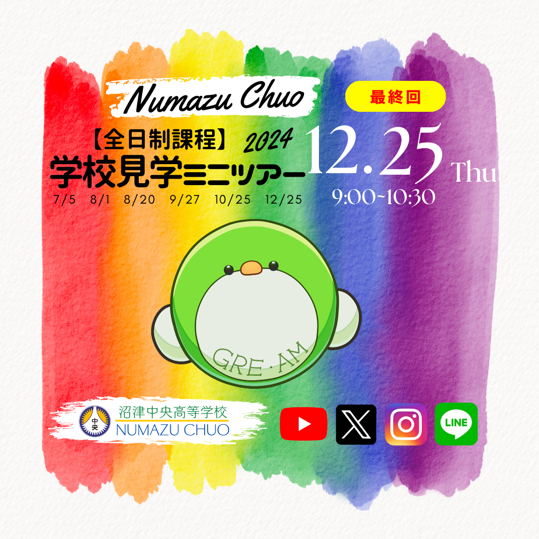 12月25日(木)は中学生対象の募集イベント「学校見学ミニツアー」が開催されます。今回は今年度全6回開催予定の最終回となります。授業はありませんので、在校生はいませんが部活動の生徒と会えるかも…休日の学校を探検してみてください!時間は9:00~10:30で、8:45より受付を開始いたします。予約サイト(miraicompass)のマイページより「受付票」を印刷し、当日受付へ提出してください。また、上履き・下足袋をご持参下さい。