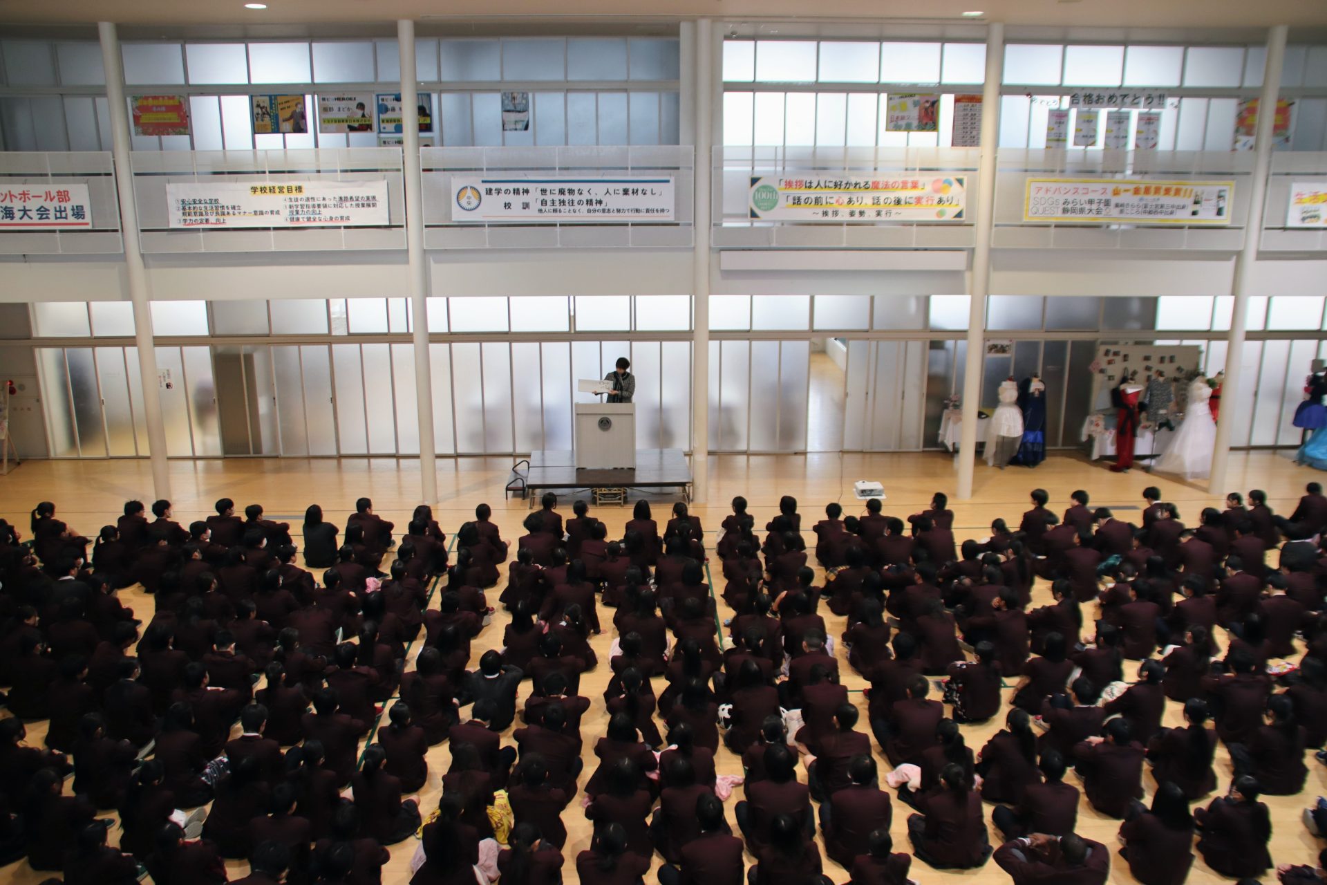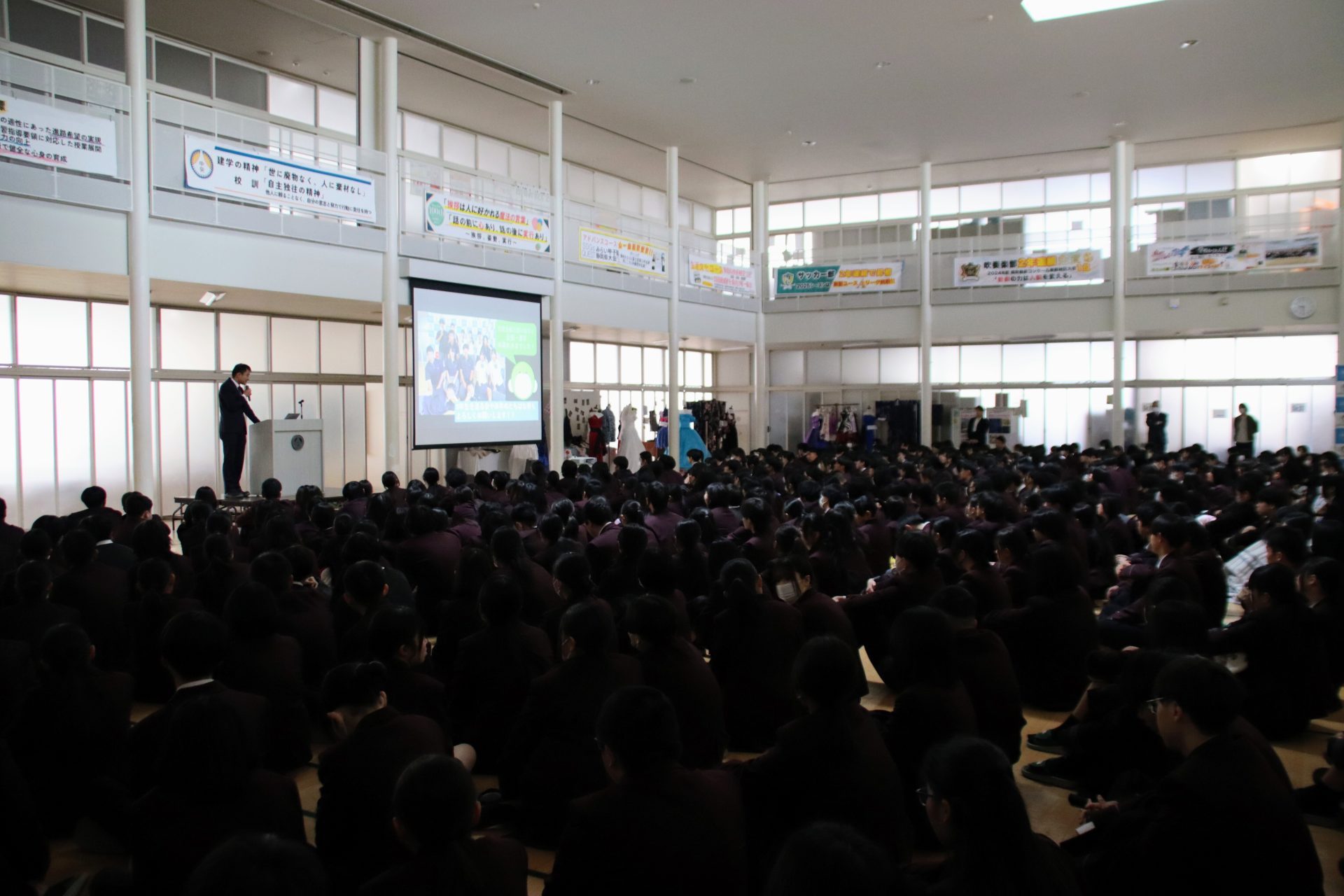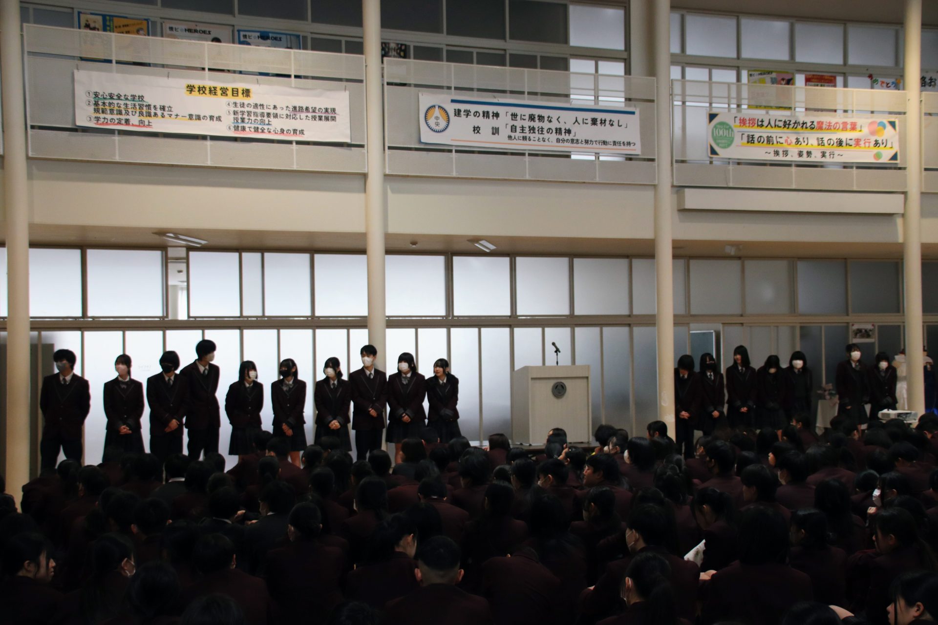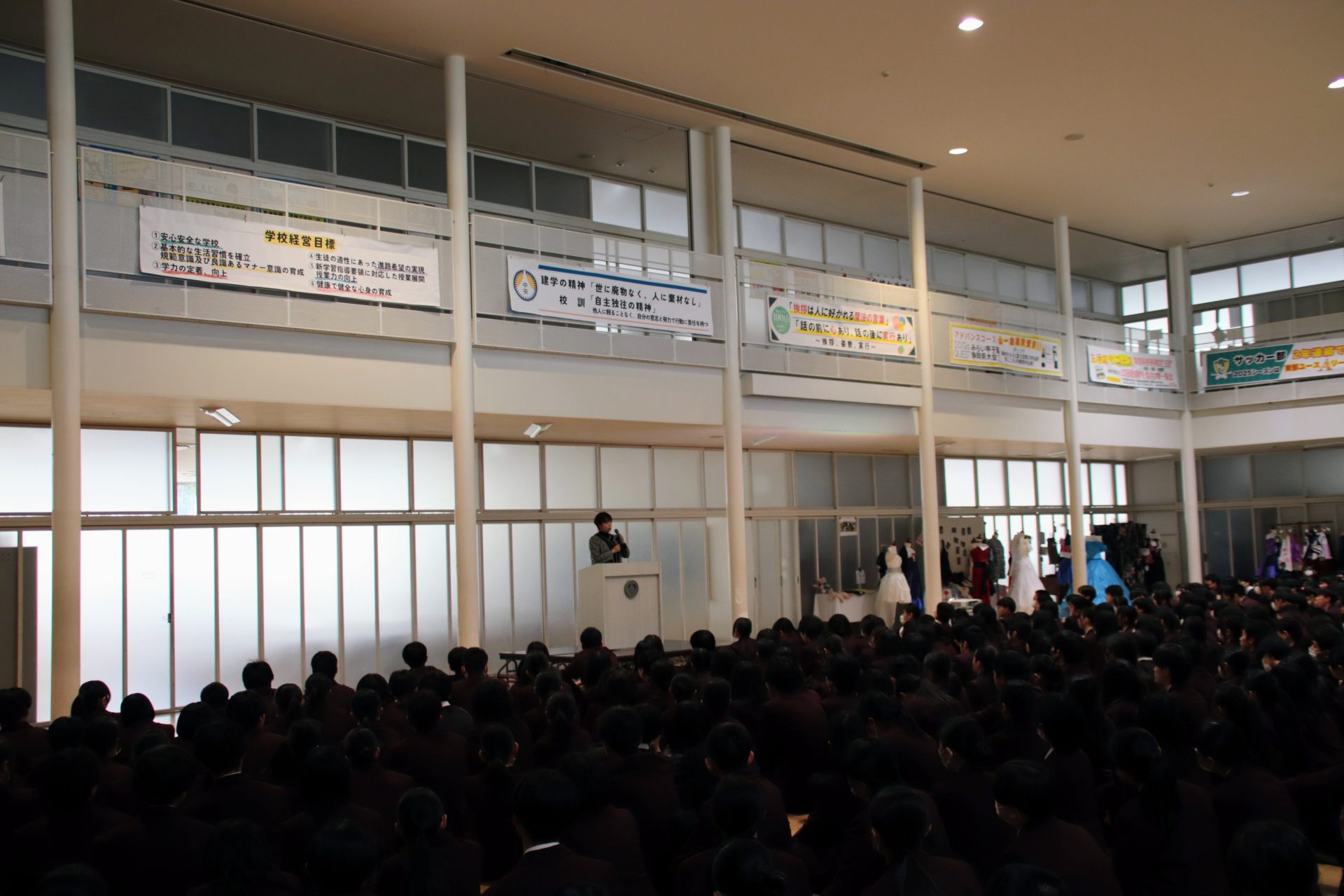 12月19日(金)に2学期の終業式が行われました。校長式辞では、メジャーリーガー・大谷翔平選手の活躍や、2年連続となった日本人のノーベル賞受賞といった明るいニュースから、緊迫する世界情勢、日本初の女性総理大臣誕生という歴史的な転換点まで、この1年を象徴する出来事に触れながら今年1年を振り返りました。また、県内の市長選や牧之原市で発生した竜巻被害など、身近なニュースにも触れ「社会の動きに敏感になり、自分に何ができるかを考えることの大切さ」が生徒たちに伝えられました。教務課からは成績優秀者の発表があり、全校生徒から称賛の拍手が送られました。生徒課からは、道路交通法の改正に伴う自転車の運転マナー等について、命を守るための具体的な話がありました。終業式後には、各種検定や部活動で顕著な成績を収めた生徒たちが表彰されました。最後に行われた軽音楽部の壮行会では、新人大会での県大会出場を決めたメンバーに対し、生徒会長から力強いエールが送られました。冬休みは課題もありますが、まずは心身をしっかりと休めてください。家族や親戚と過ごす時間を大切にし、新年、また元気に登校する皆さんに会えるのを楽しみにしています。