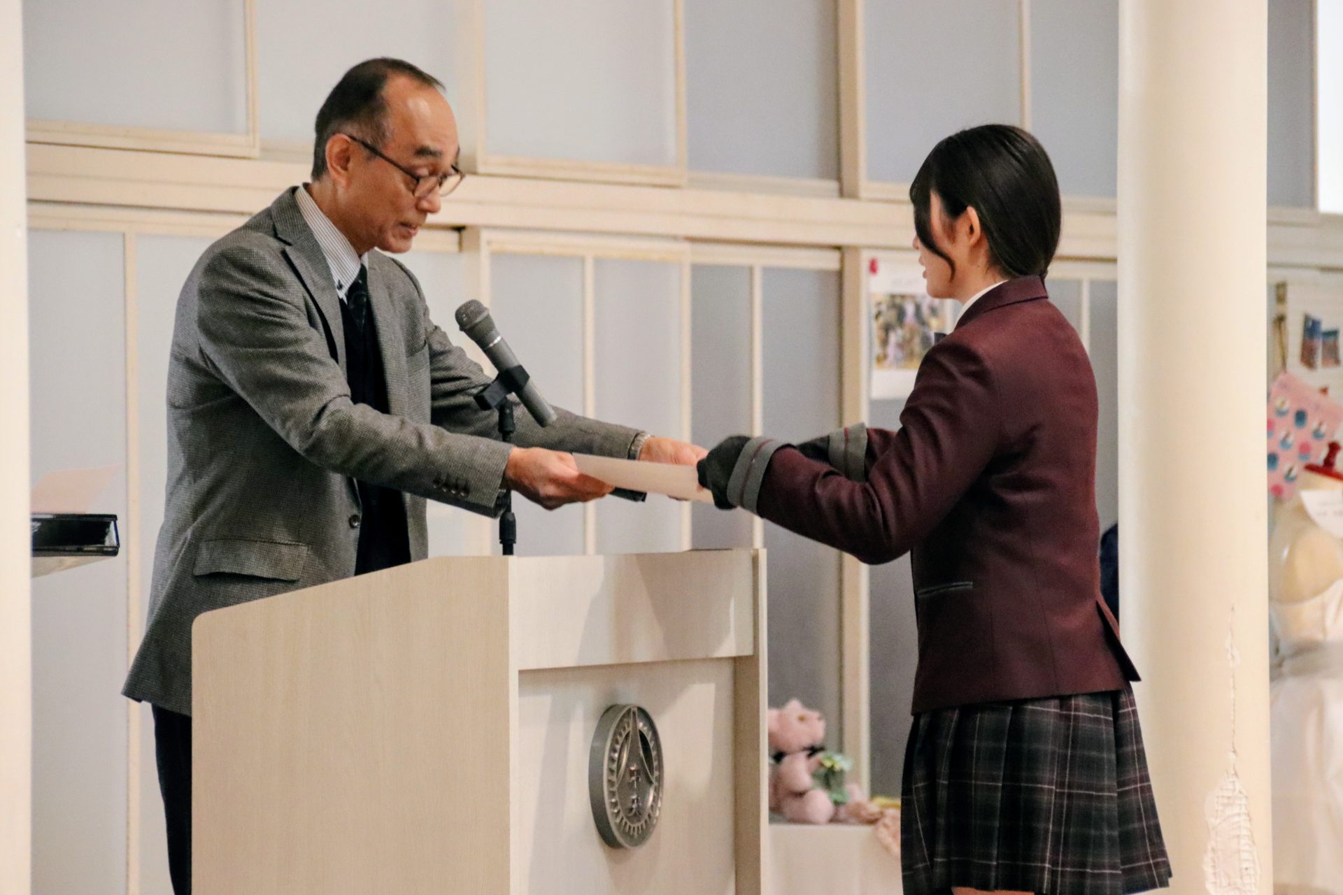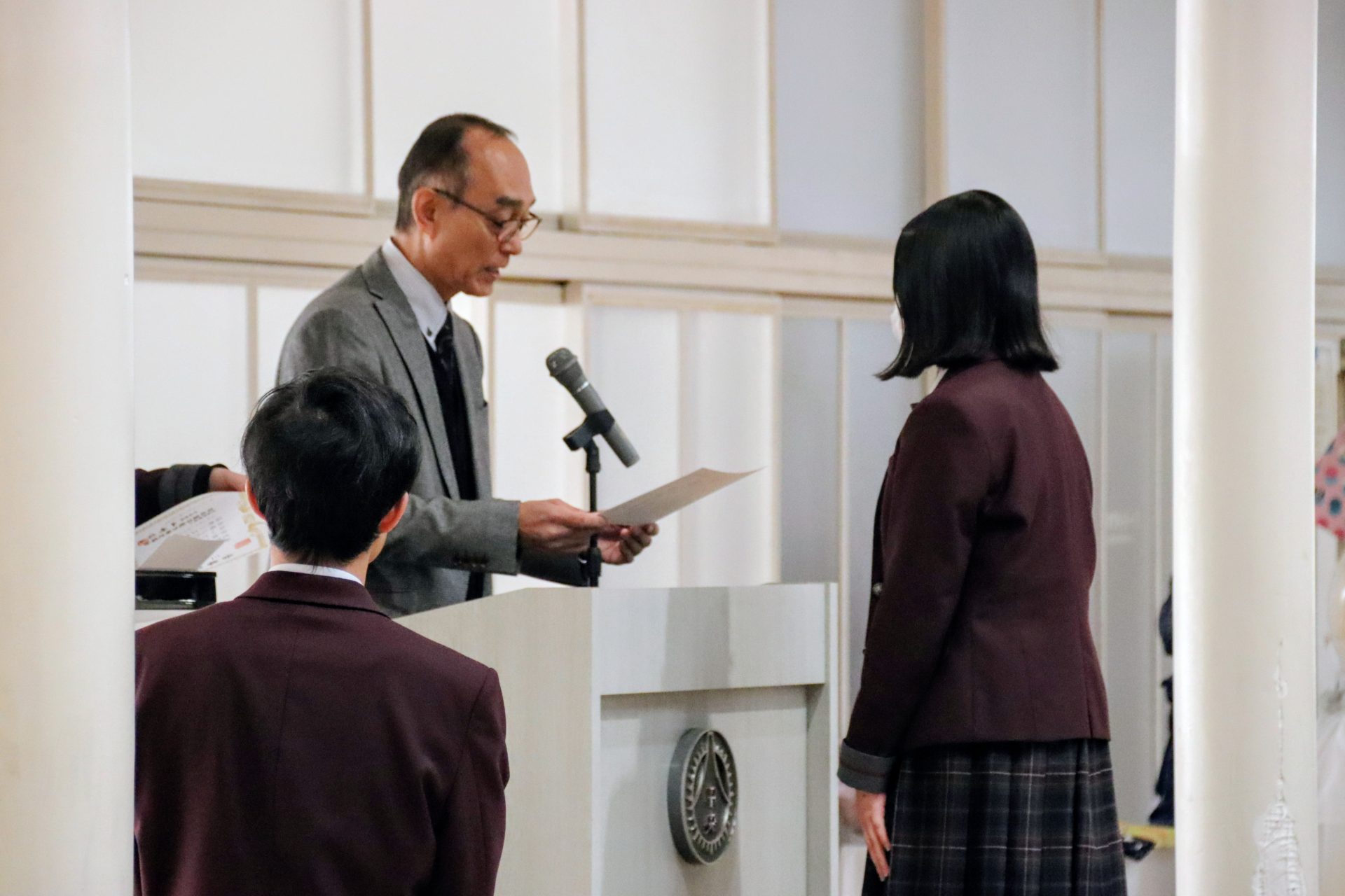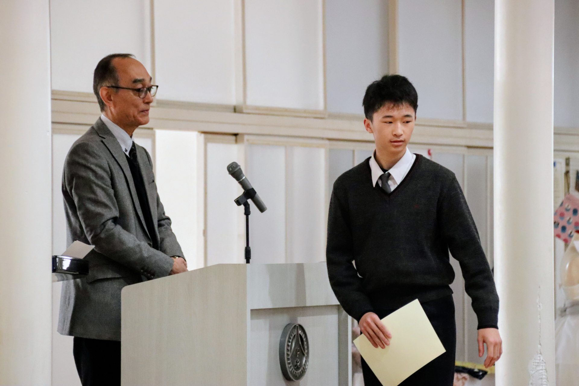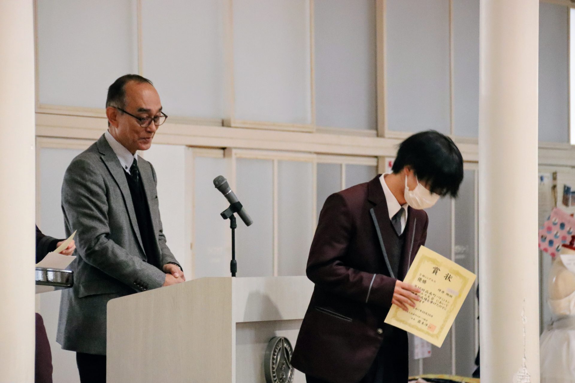 12月19日(金)に2学期の終業式が行われました。校長式辞では、メジャーリーガー・大谷翔平選手の活躍や、2年連続となった日本人のノーベル賞受賞といった明るいニュースから、緊迫する世界情勢、日本初の女性総理大臣誕生という歴史的な転換点まで、この1年を象徴する出来事に触れながら今年1年を振り返りました。また、県内の市長選や牧之原市で発生した竜巻被害など、身近なニュースにも触れ「社会の動きに敏感になり、自分に何ができるかを考えることの大切さ」が生徒たちに伝えられました。教務課からは成績優秀者の発表があり、全校生徒から称賛の拍手が送られました。生徒課からは、道路交通法の改正に伴う自転車の運転マナー等について、命を守るための具体的な話がありました。終業式後には、各種検定や部活動で顕著な成績を収めた生徒たちが表彰されました。最後に行われた軽音楽部の壮行会では、新人大会での県大会出場を決めたメンバーに対し、生徒会長から力強いエールが送られました。冬休みは課題もありますが、まずは心身をしっかりと休めてください。家族や親戚と過ごす時間を大切にし、新年、また元気に登校する皆さんに会えるのを楽しみにしています。