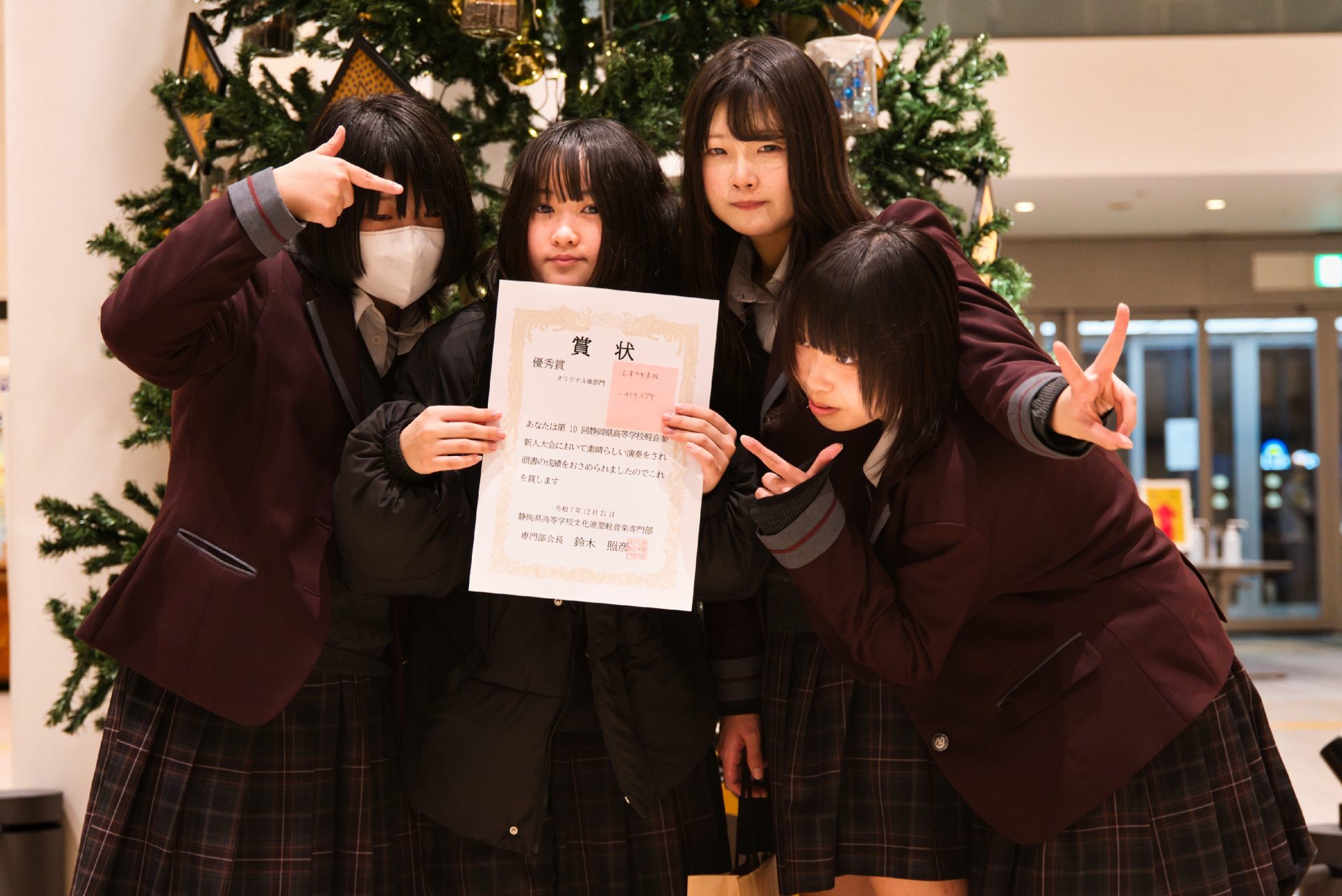 12月21日(日)に開催された第10回静岡県高等学校軽音楽新人大会のオリジナル曲部門において、「-459.67℉」が優秀賞を受賞し、3月に名古屋で開催される第4回全国高等学校軽音楽発表会への出場が決まりました。今大会は本校から5バンドが出場し、「制服機動隊」も奨励賞を受賞するなど、本校の軽音楽部5バンドが躍動しました。また、個人賞として制服機動隊の君山りまさん(2年・長泉中出身)がドラマー賞を受賞しました。その他の3バンドは惜しくも賞を逃しましたが、今大会で大きく成長し、夏には今大会以上の活躍が期待できます。