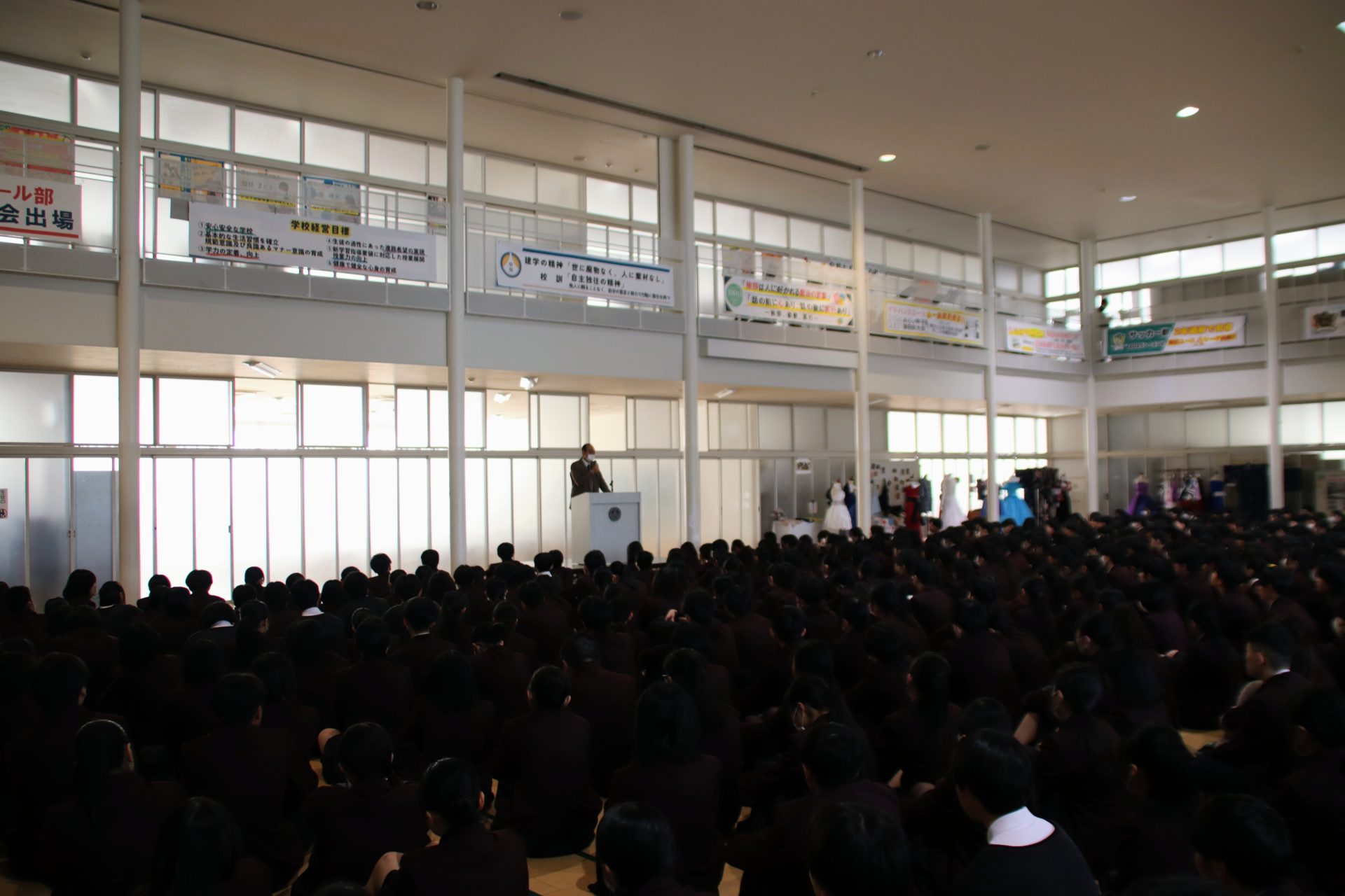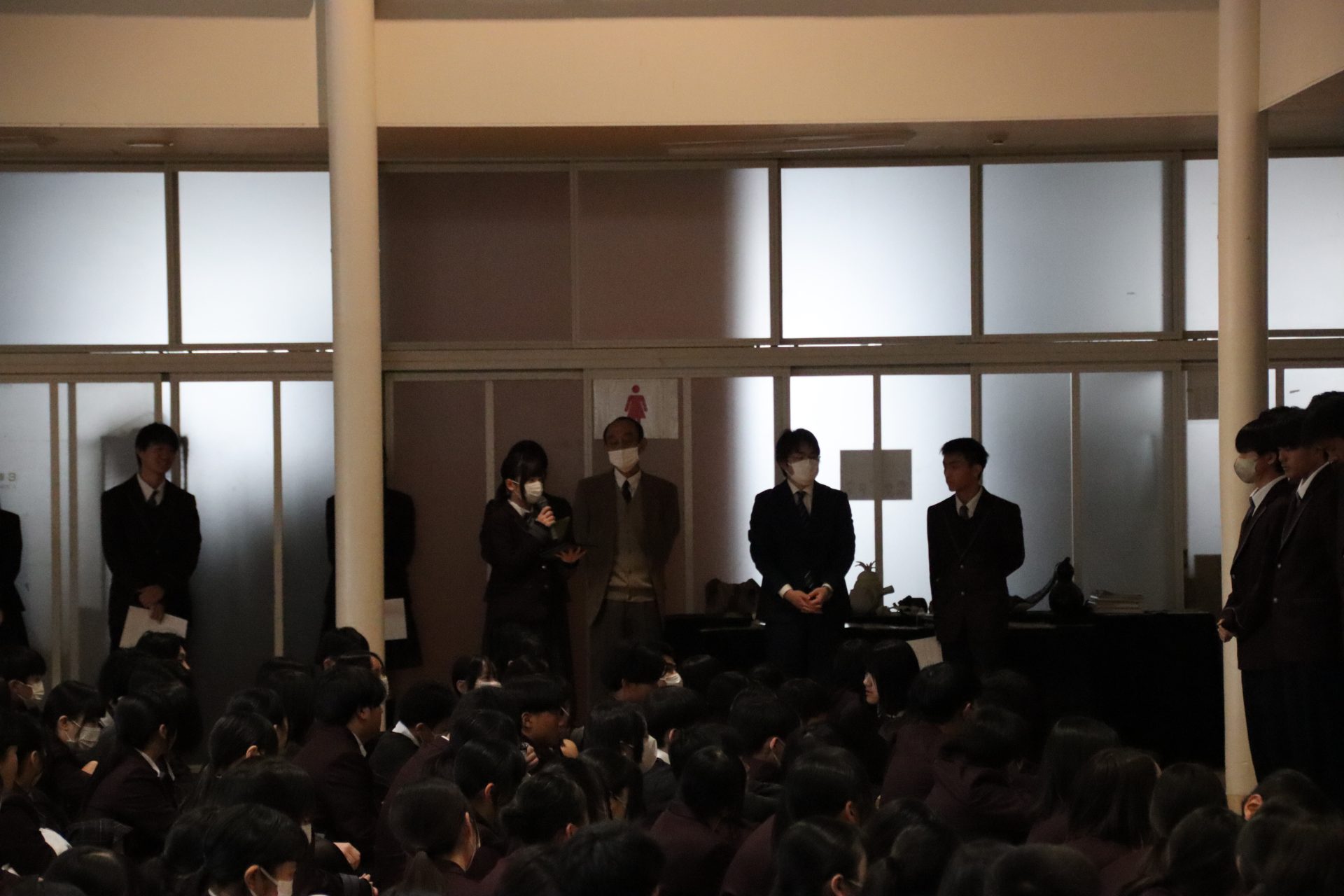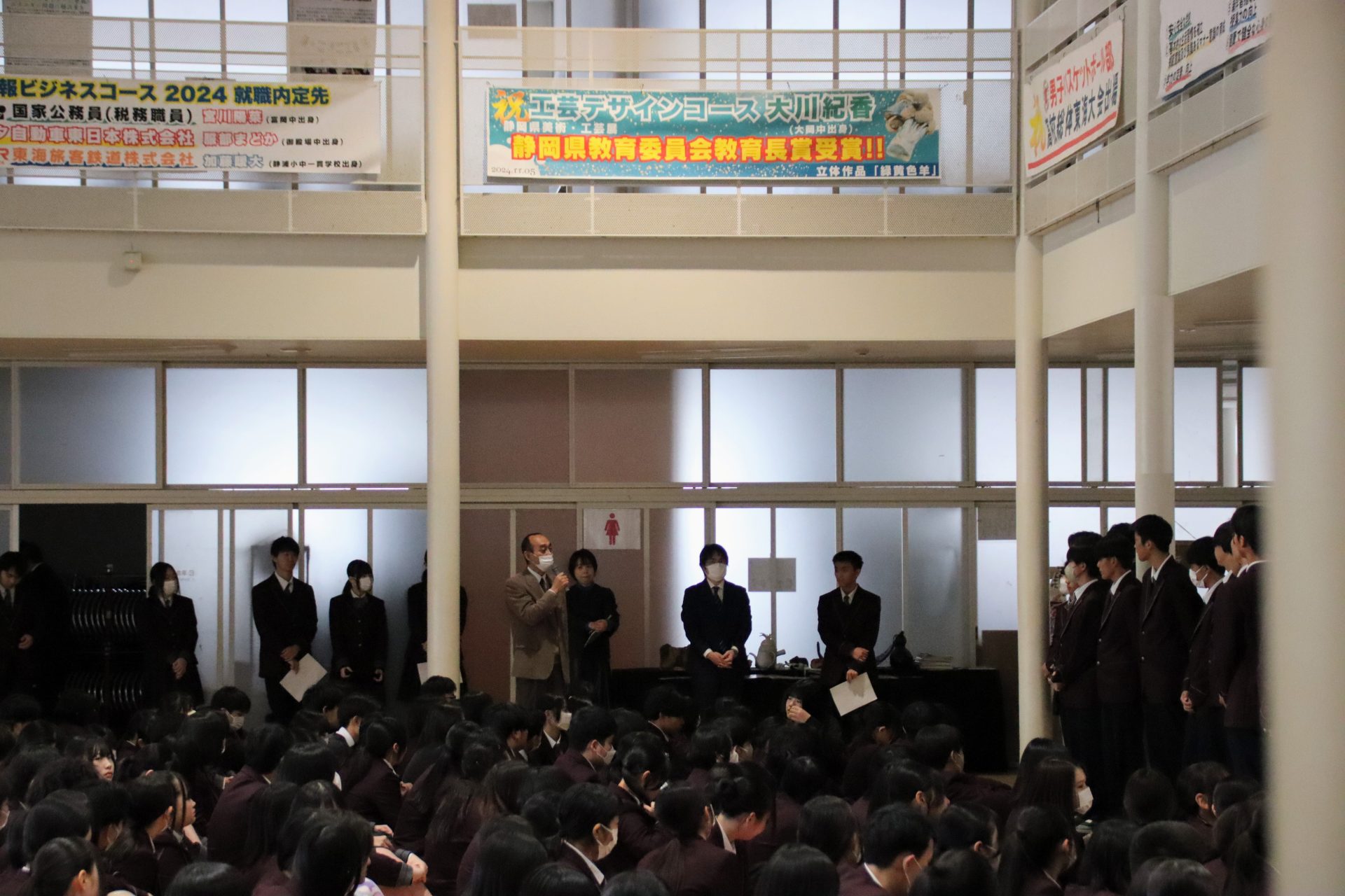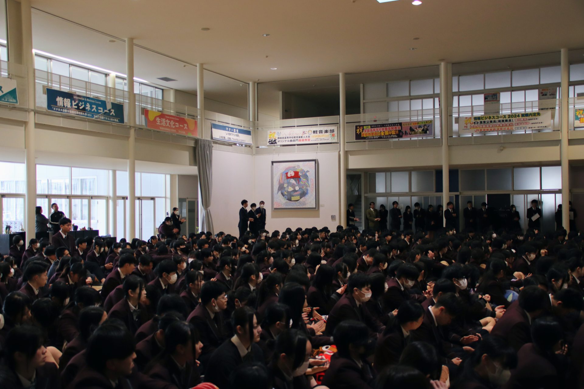 1月6日(火)から3学期がスタートしました。始業式では、校長先生から式辞があり、お正月にまつわる日本の文化や風習についてのお話に加え、社会情勢や昨年12月に長泉町で発生した事件で高校生が逮捕されたことにも触れられました。校長先生は「一人ひとりが責任ある行動を心がけることの大切さ」を強調し、生徒たちに深い考えを促す内容となりました。集会では、嬉しい報告もありました。軽音楽新人大会で優秀賞を受賞し、全国大会への出場を決めたバンドが表彰され、会場は大きな拍手に包まれました。さらに、県大会出場を決めている卓球部とサッカー部の壮行会も行われ、仲間たちから熱いエールが送られました。新しい学期の始まりにふさわしい、決意と期待に満ちた一日となりました。