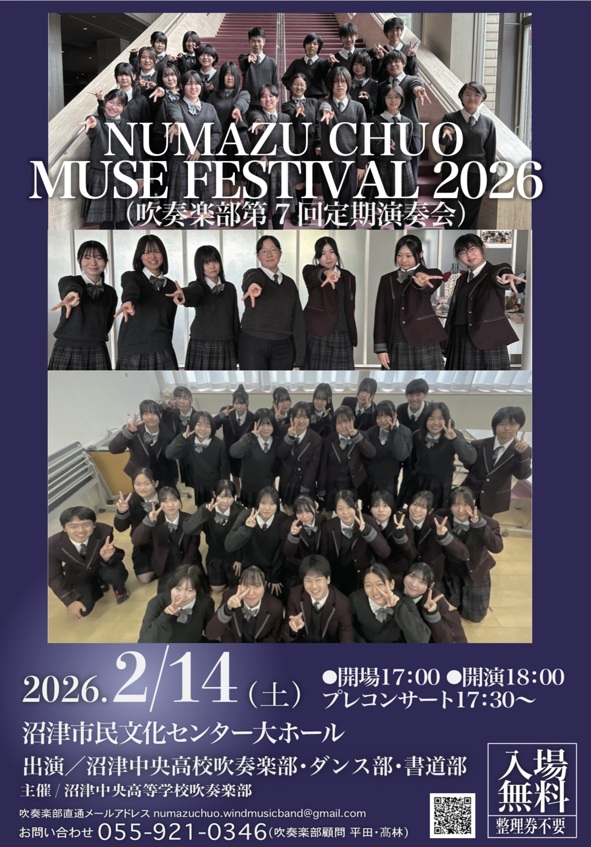 今年もこの季節がやって来ました!吹奏楽部による演奏のほか、ダンス部と書道部が日々の活動の成果を発表します。令和8年2月14日(土)開催、17:00開場18:00開演となります。また、17:30よりプレコンサートを行います。ぜひ、沼津市民文化センターへお越しください。