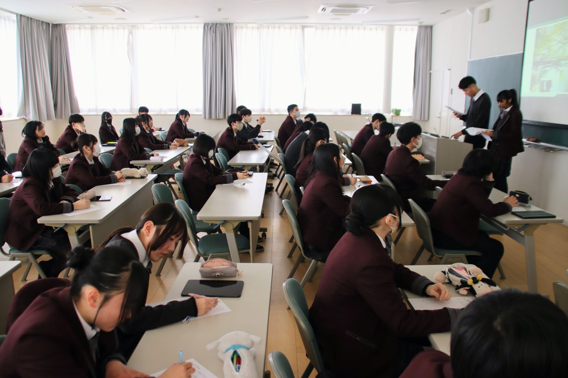 2月6日(金)にアドバンスコースの2年生が1年生に向けて課題研究の発表を行いました。今年度の研究テーマは「市民が命をつなぐ場所づくり」「源兵衛川の生態調査&ザリガニによる在来種への影響を考える」「新しい空き家ビジネスについて」「国際社会における日本の人手不足対策」「人の緊張のしやすさにはどんな違いがあるか」「市域経済の活性化」「選手のパフォーマンス向上に寄与する栄養戦略について」など22テーマで、生徒たちは4月から9か月をかけてそれぞれの研究テーマについて、時にはアドバイザーとなる先生の助言を受けながら探究活動を行いました。アドバンスコースでは総合的な探究の時間に課題研究を進めています。興味・関心をもった事柄について、主体的に学ぶ姿勢を高め、進学する学部・学科への理解を深めることを目標にしています。受験前に目指す将来像をより具体的に描けるように取り組んでいます。2年生が課題研究の成果を1年生に披露することで、コース間の交流を図るとともに3年間を見据えた段階的な進路研究をしています。